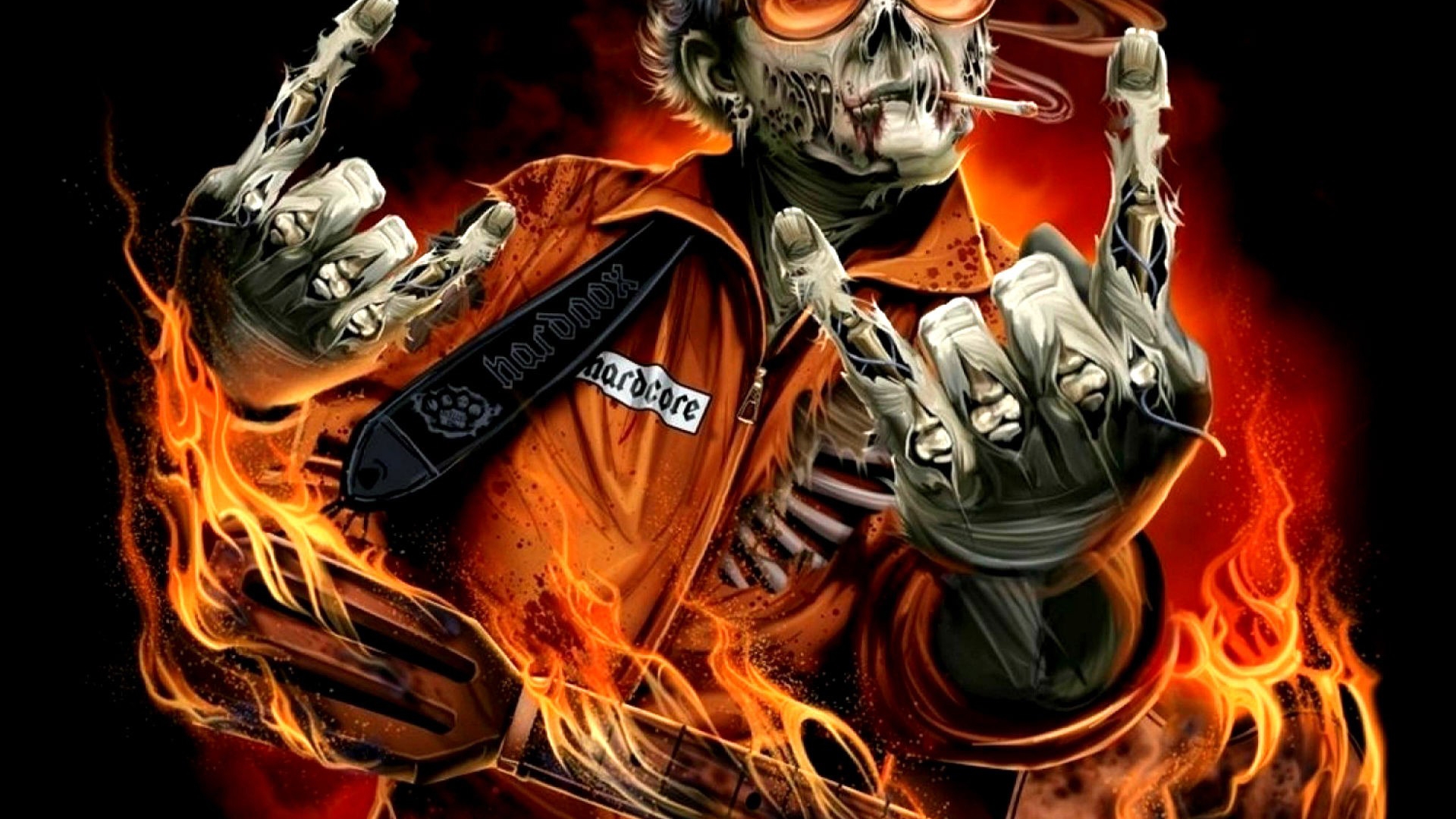 Description: A skeleton with a hat and glasses holding a knife and a cigarette in his hand and a flamey background.