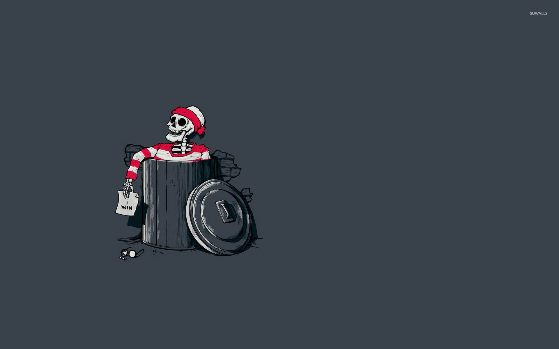 Description: A skeleton in a santa hat sitting in a trash can with a bag on it's back and a bag in the other hand.