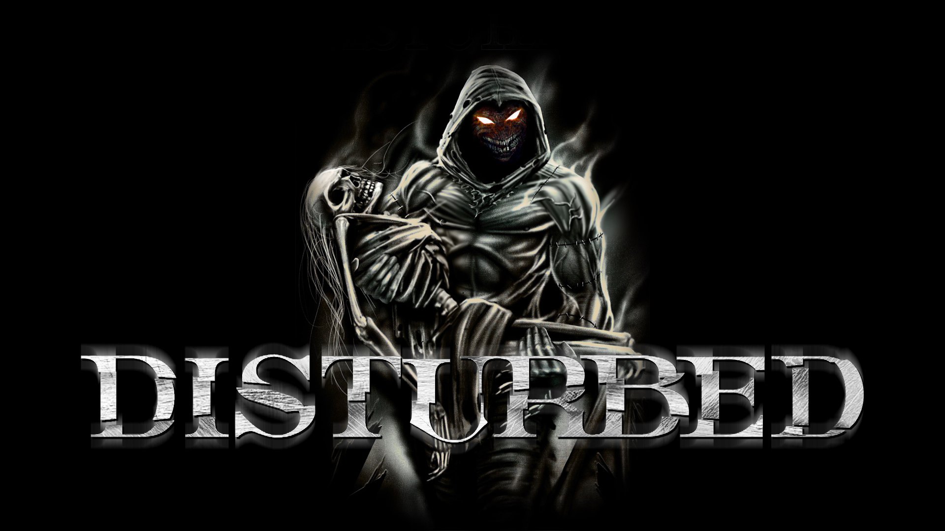 Description: A dark background with a skeleton holding a sculler and the words disturbed in the middle of it.