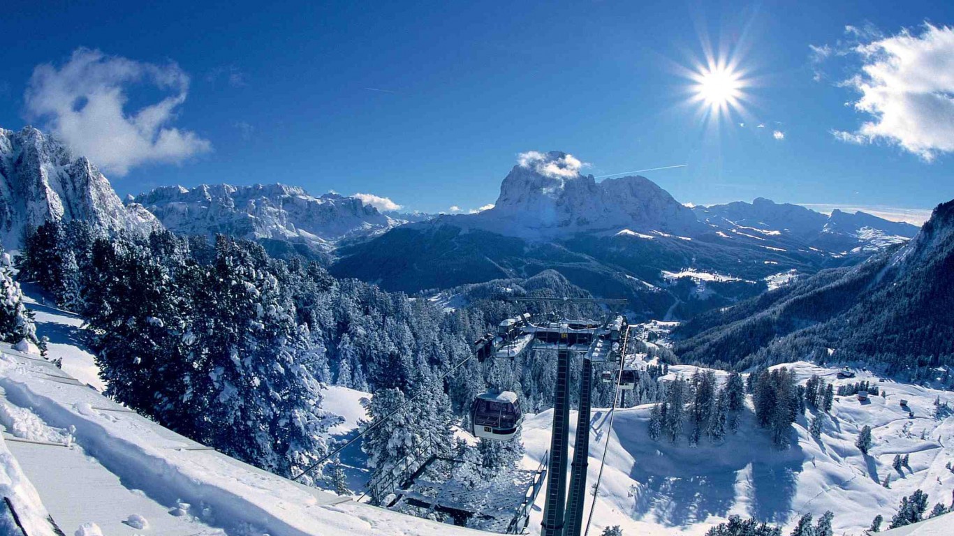Description: A ski lift is on a snowy mountain side with trees and mountains in the background and a bright sun.