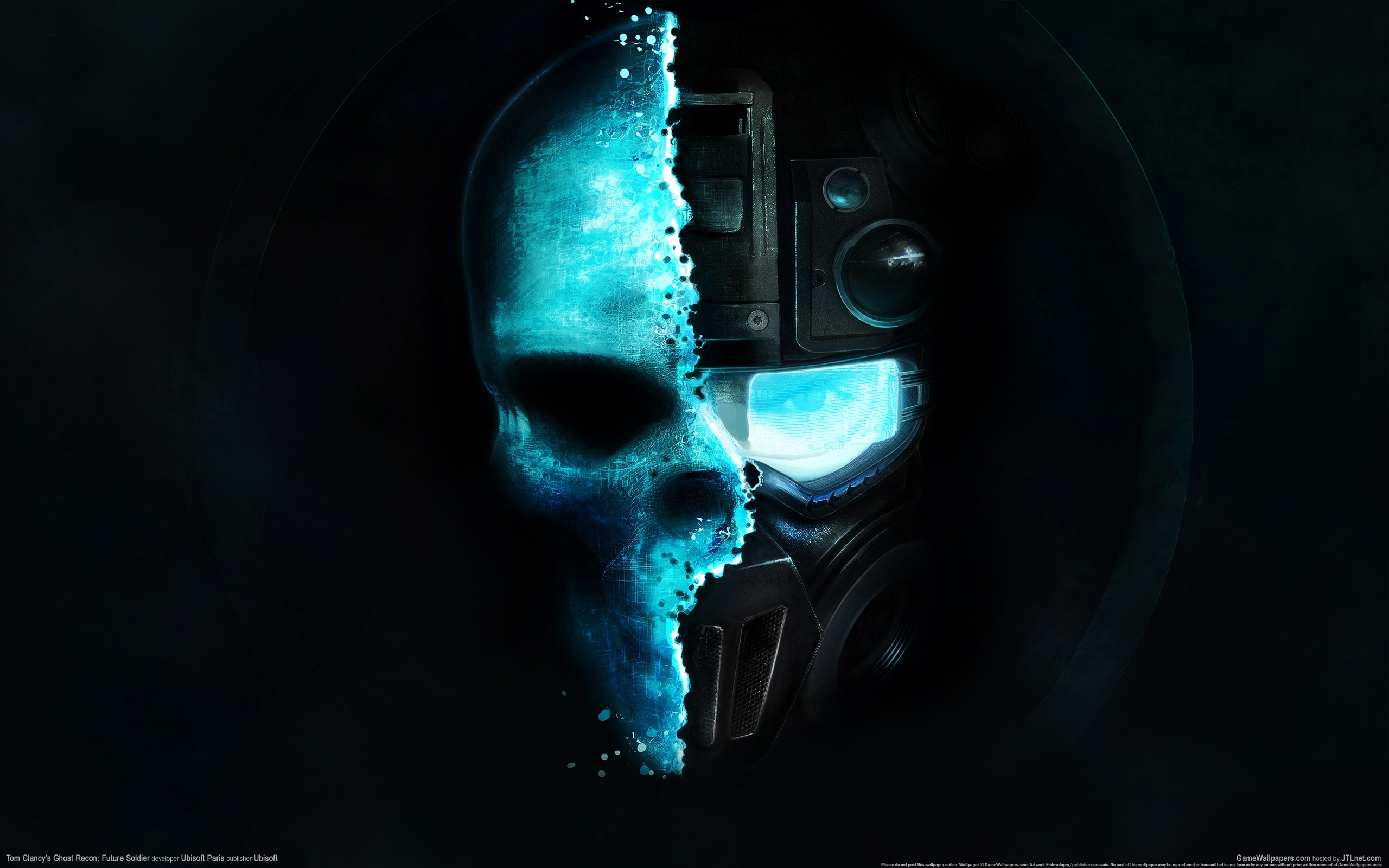 Description: A skull with a blue light in its eyes and a black background with a blue light in its eyes.