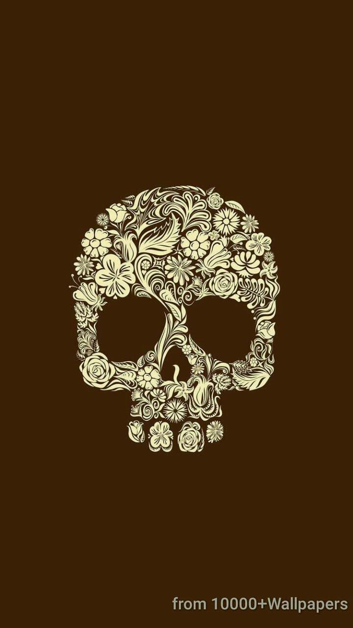 Description: A skull with flowers on it's head and a brown background with a brown background and a brown background with a white skull with a flower on it's head.