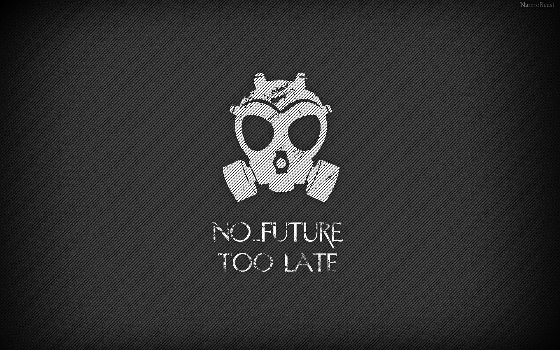 Description: A skull with a gas mask and a no future too late message on it's face is shown.