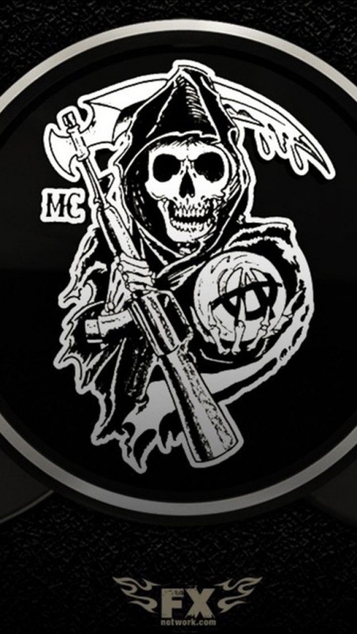 Description: A black and white picture of a skull with a gun and a skull on it's back with a skull on the front.