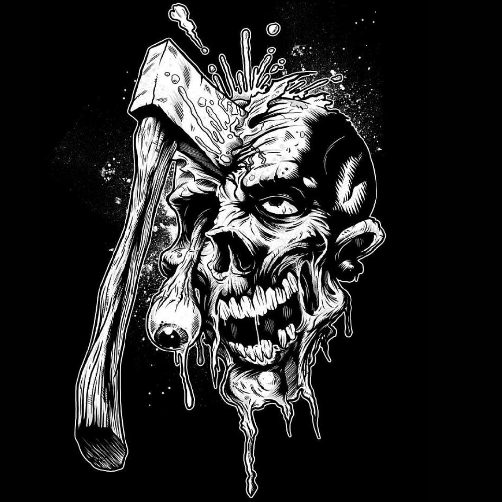 Description: A skull with a hammer and a bloody face on a black background with splatters of paint and splatters of paint.