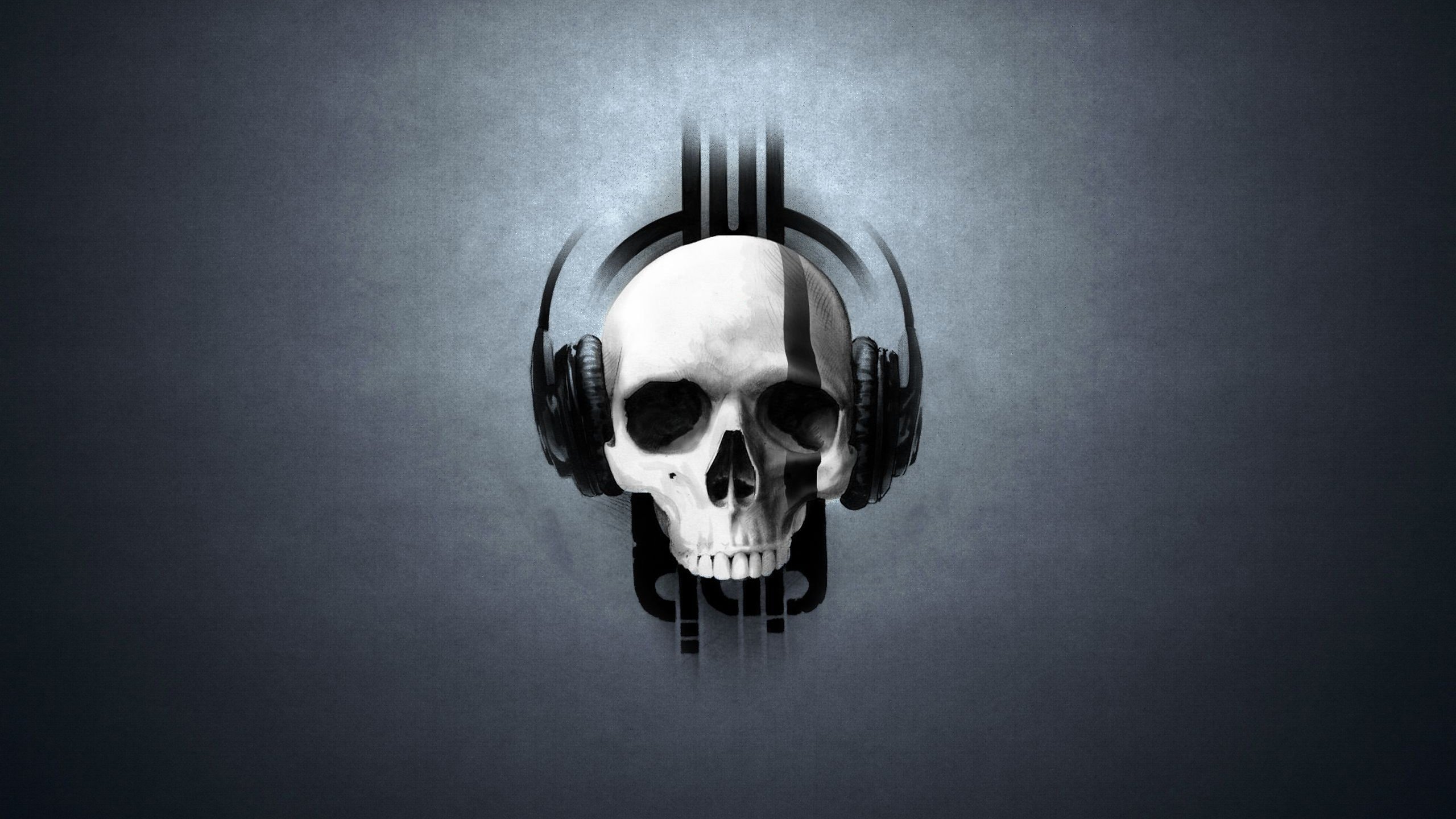 Description: A skull with headphones on its face is shown in a dark room with a black background and a gray background.
