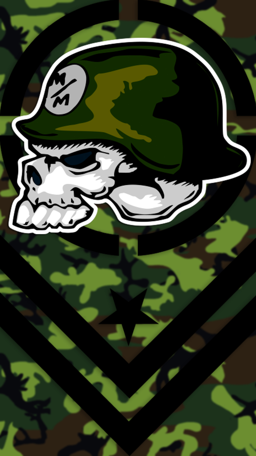 Description: A skull wearing a helmet with a green camo background is shown in the shape of a heart with a black star.