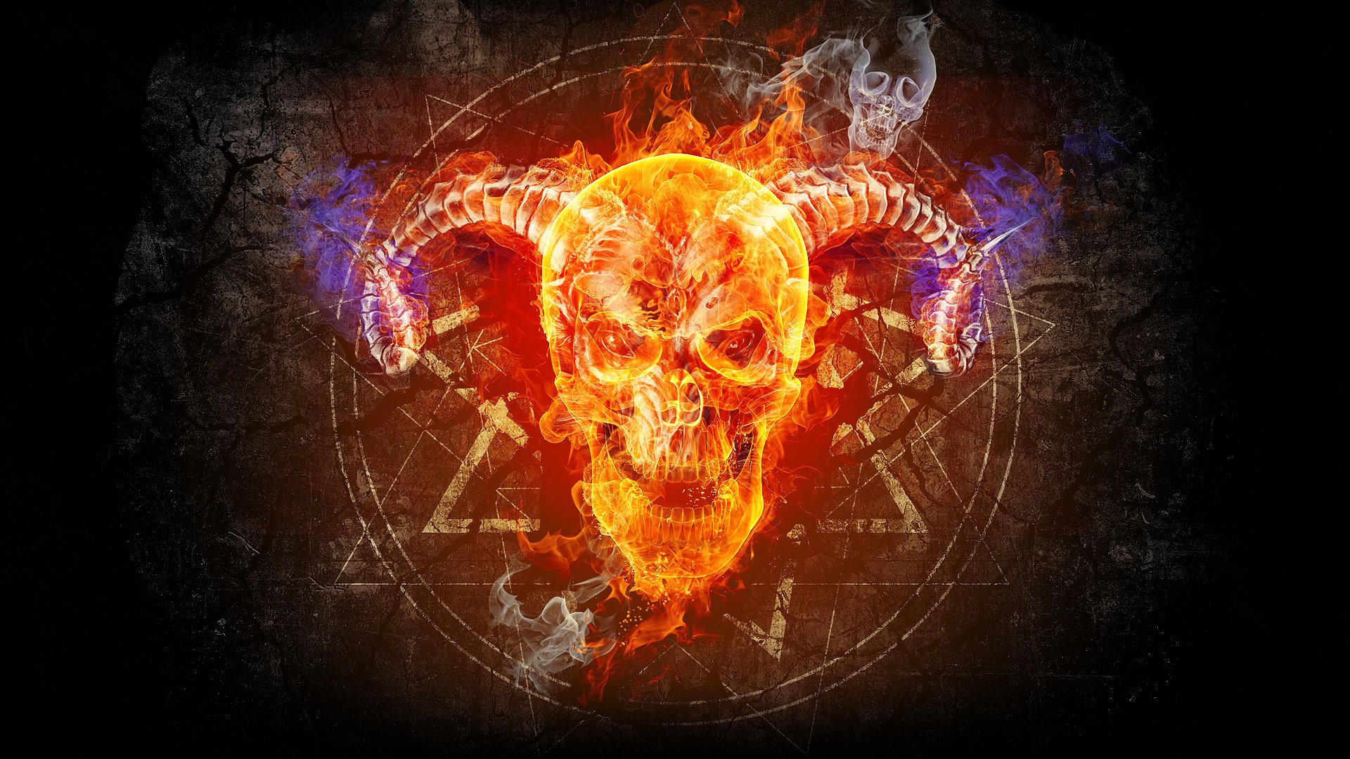 Description: A skull with horns and horns on fire with a pentagramus symbol in the middle of it.