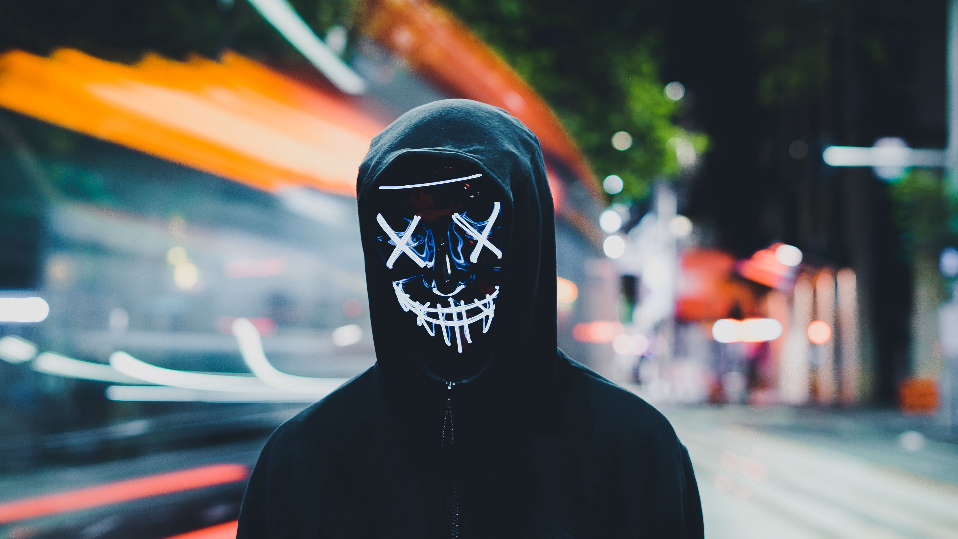 Description: A person wearing a black mask with a skull on it's face and a black hoodie on.