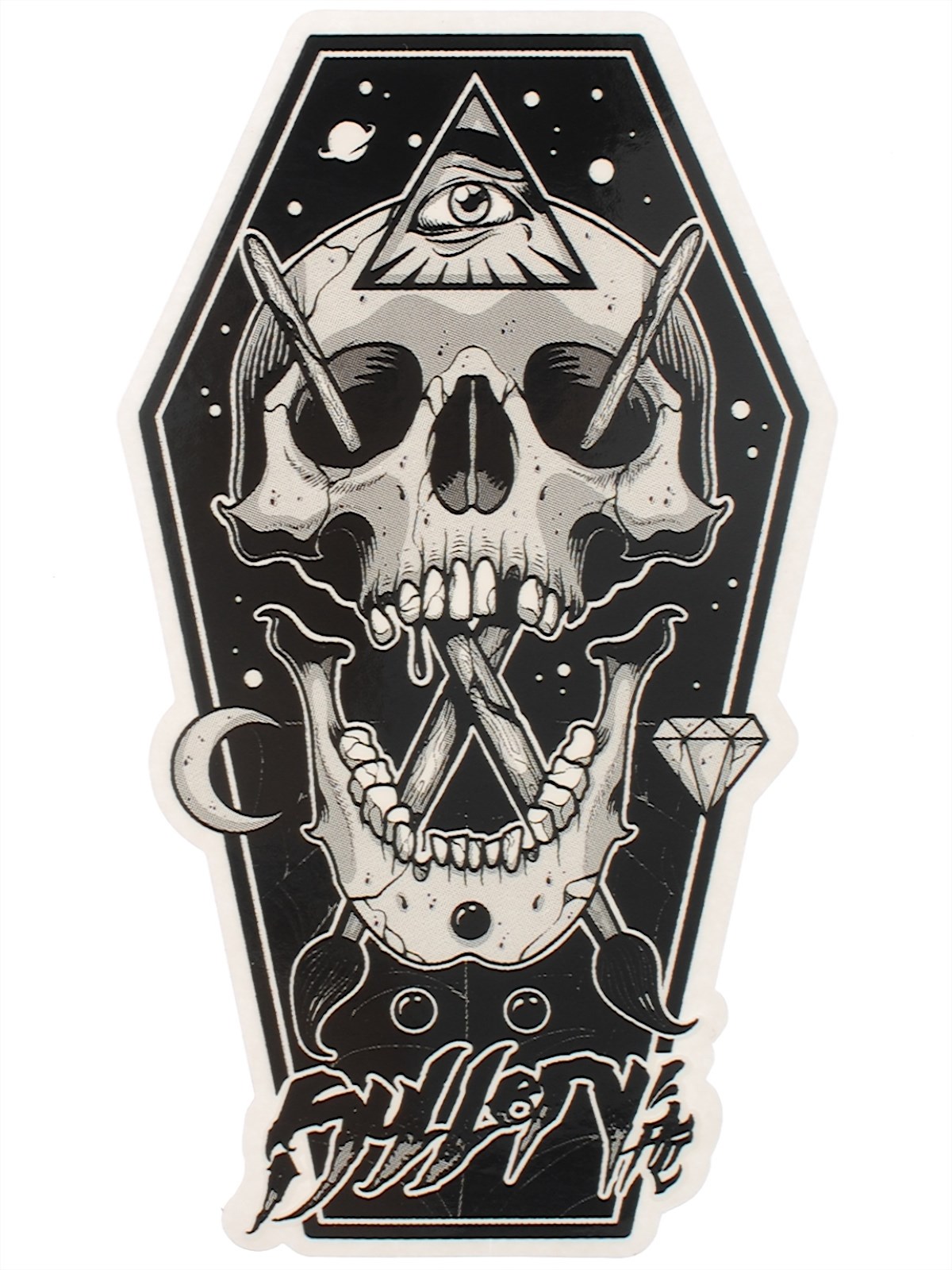 Description: A sticker with a skull and a triangle on it's face and a third eye on the skull.