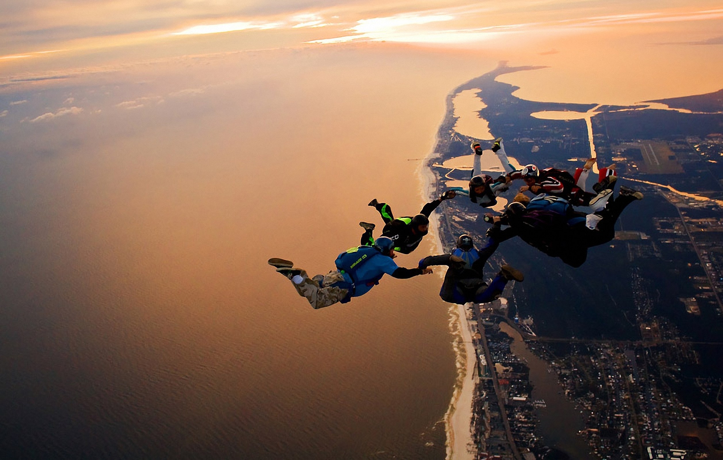 Description: Two people are skydiving over a city and a body of water at sunset or sunrise or sunset.