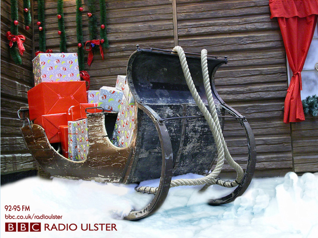 Description: A sled with presents on it in the snow next to a christmas tree and a wooden wall with red and green decorations.