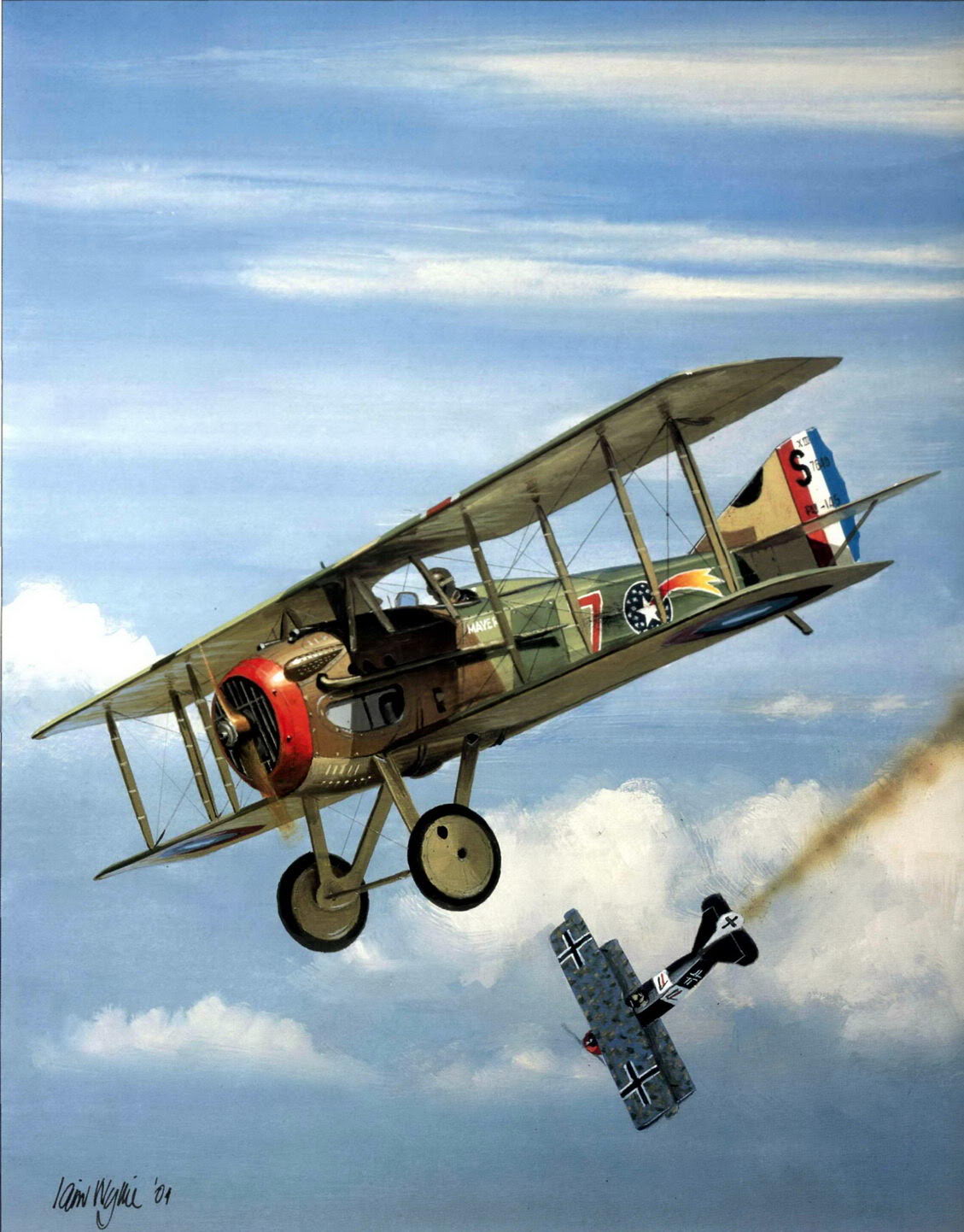 Description: A small airplane flying through a blue cloudy sky with a propeller plane in the air and a man in the cockpit.