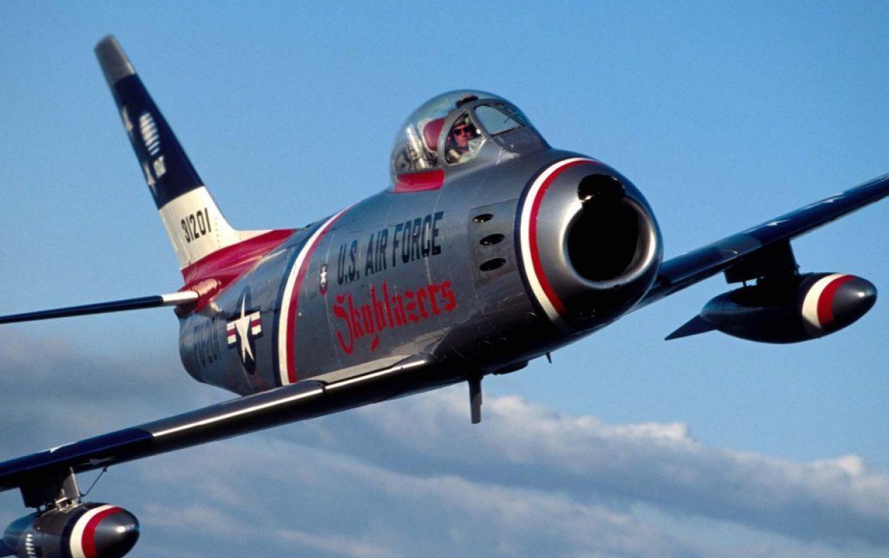 Description: A small airplane flying through a blue sky with clouds in the background and a red and white stripe on the side of the plane.