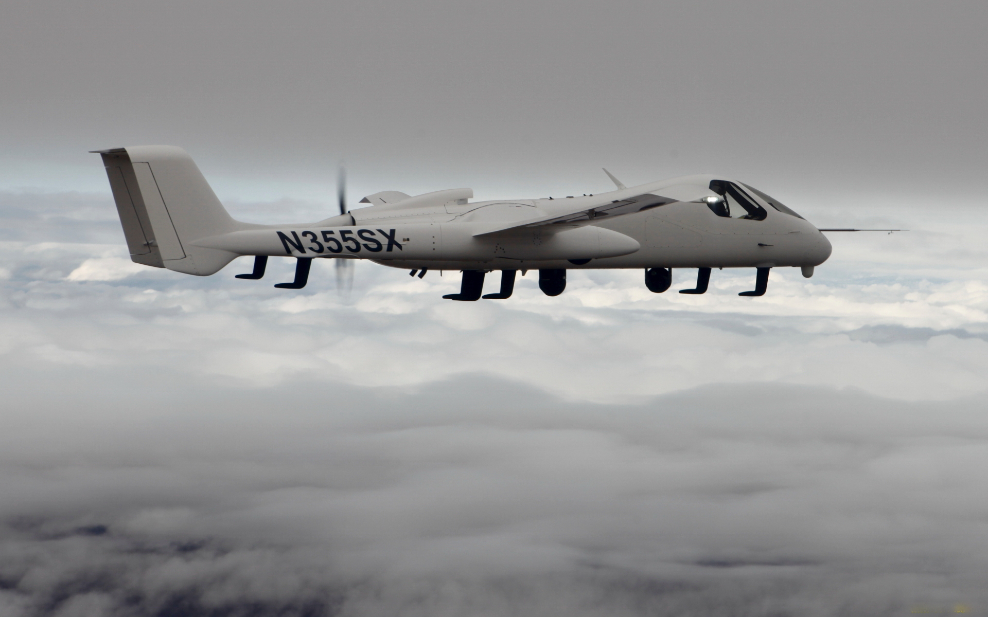 Description: A small airplane flying through the air above the clouds in the sky with a propeller on the wing and a propeller on the wing.