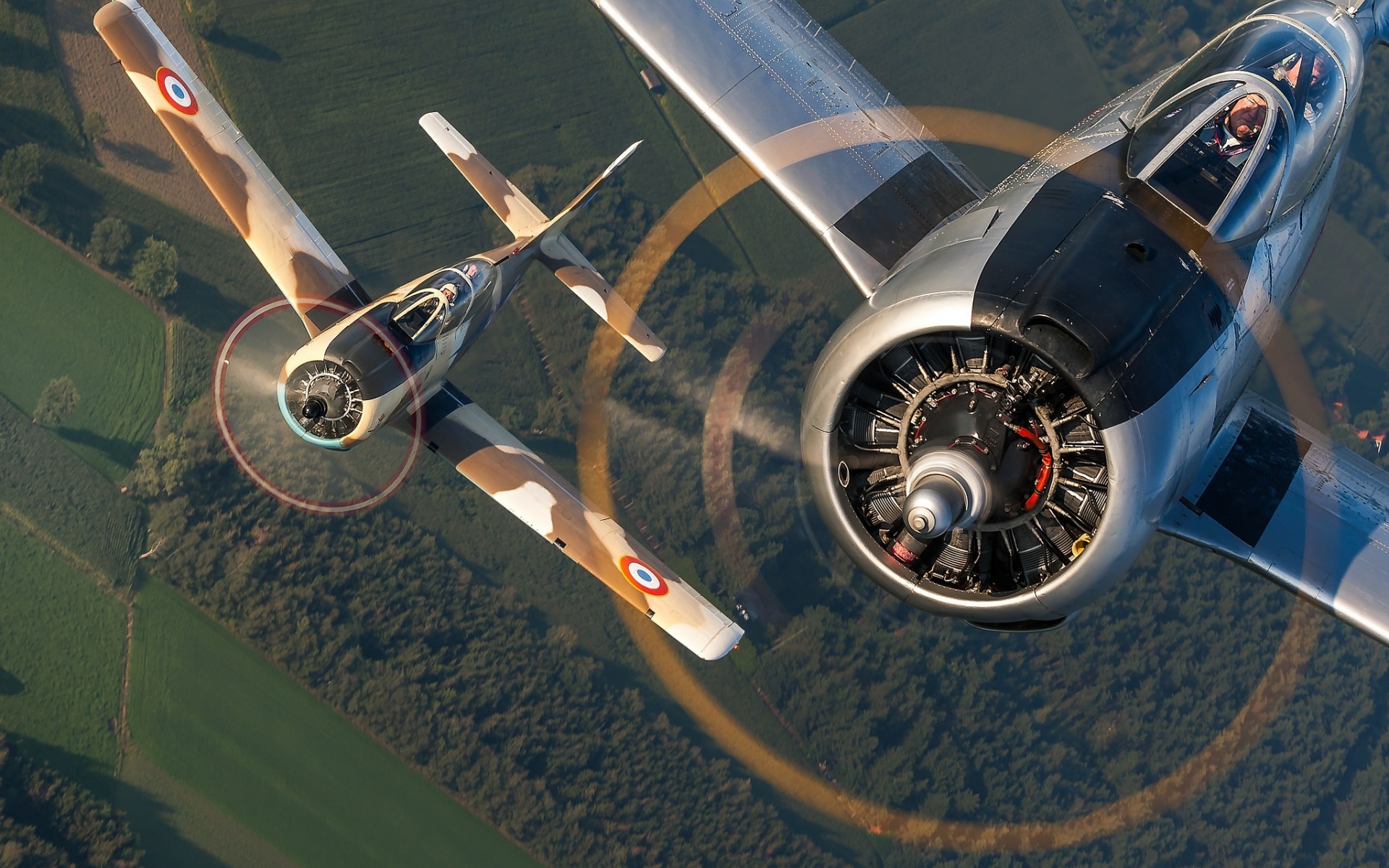 Description: A small airplane flying through the air with a propeller on it's side and a propeller on the other side of the plane.