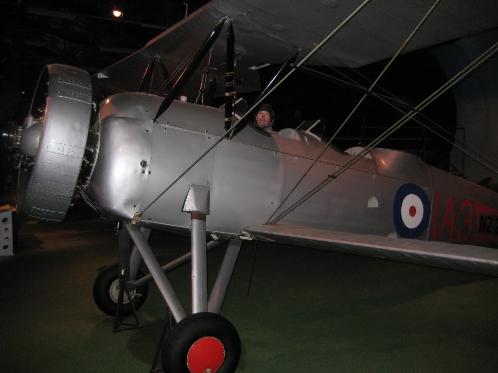 Description: A small airplane with a man sitting in it's cockpit window and a green floor with a green carpet.