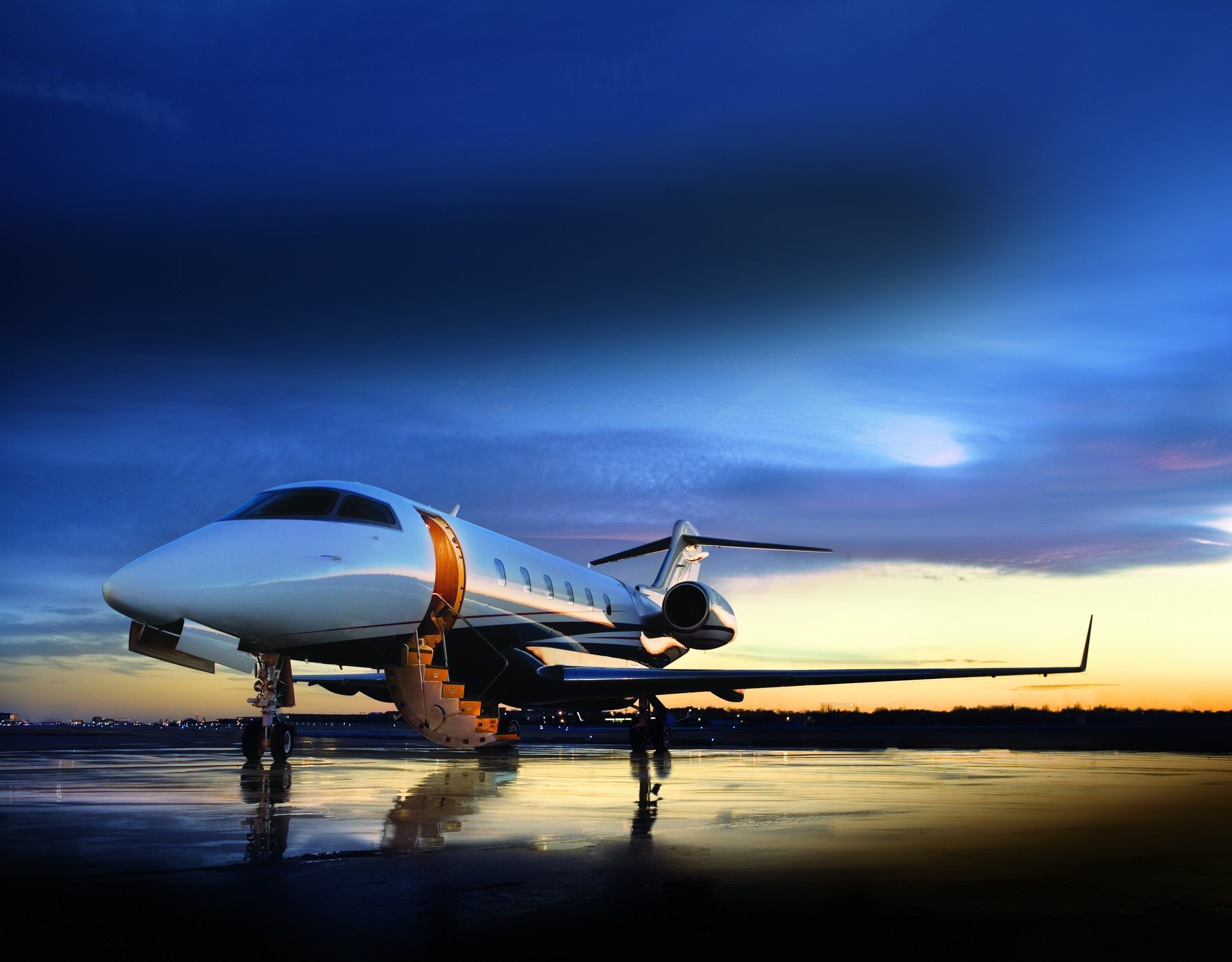 Description: A small airplane sitting on top of a runway at sunset with a sky background and clouds in the background.