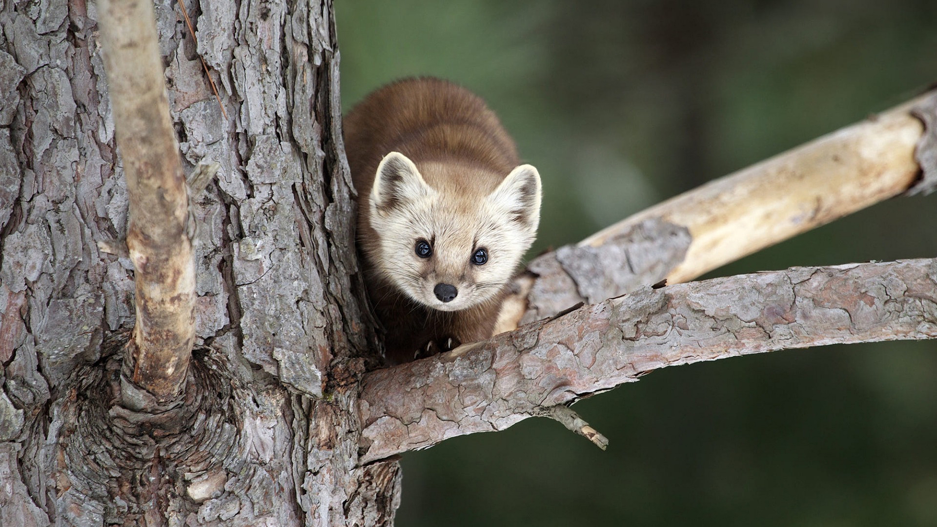 Description: A small animal is peeking out of a tree branch.
