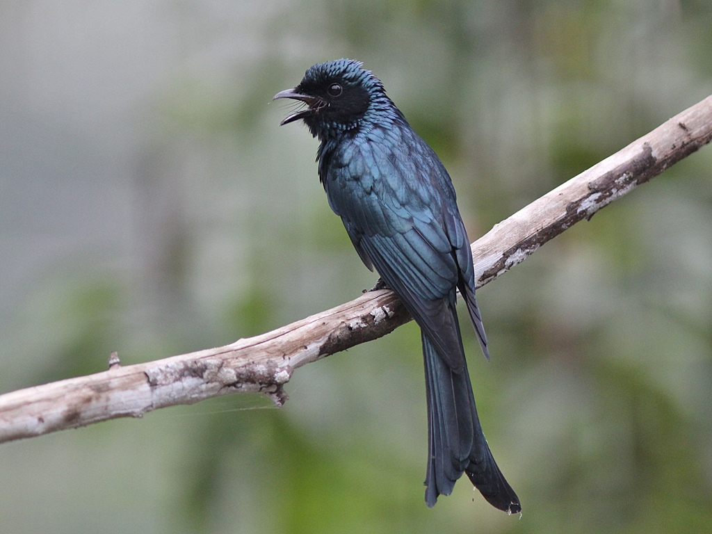 Description: A small bird sitting on a branch with its mouth open and tongue out.