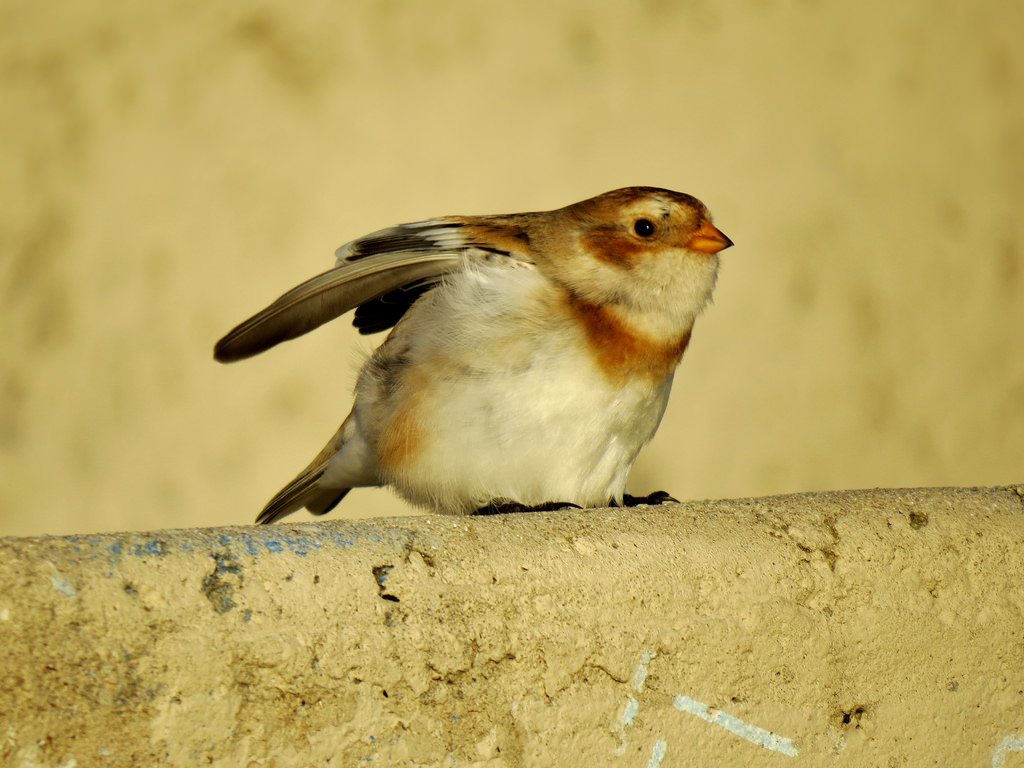 Description: A small bird sitting on top of a cement wall next to a wall with writing on it's side.