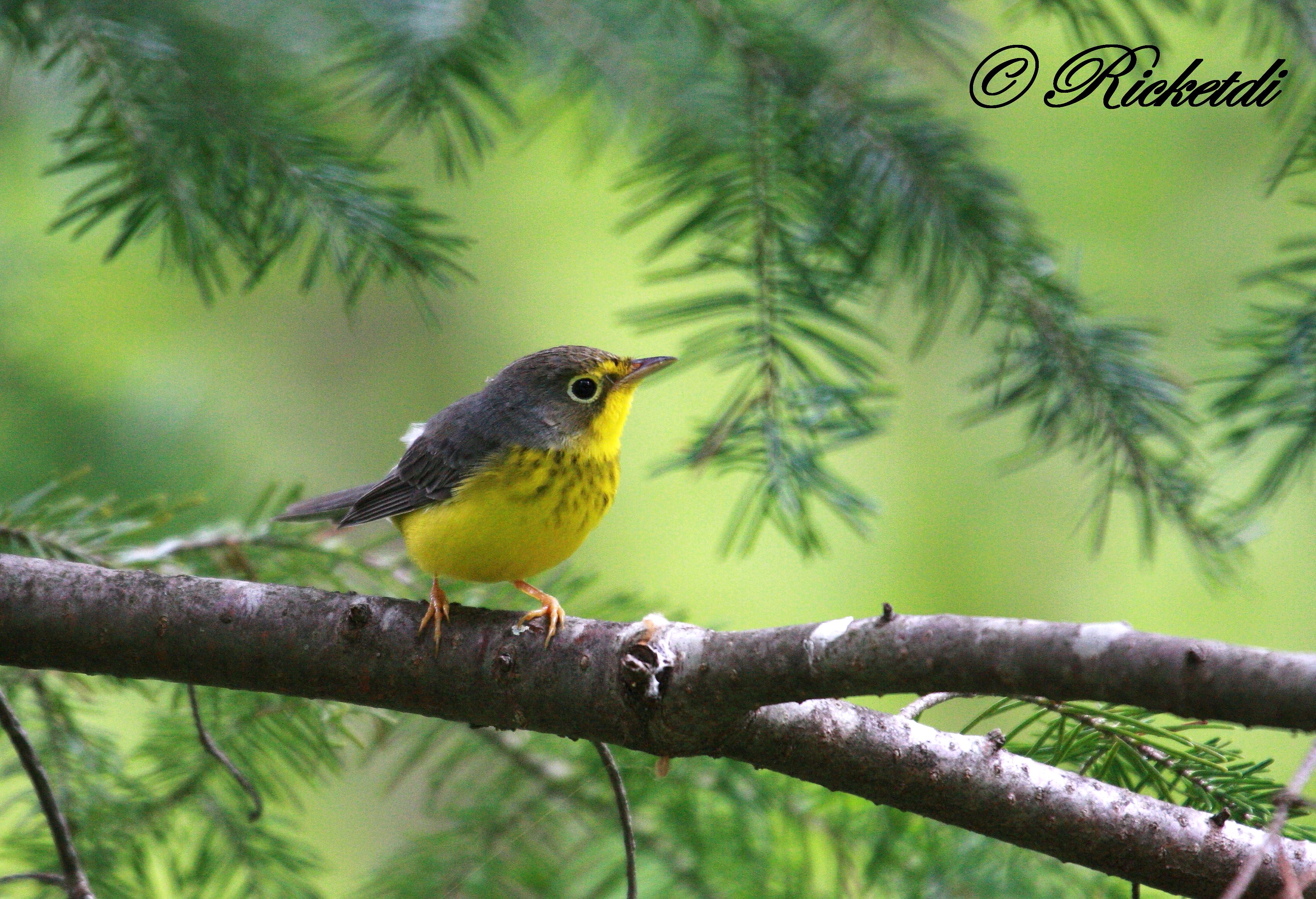 Description: A small bird perched on a branch of a tree in a forest with green leaves and a blurry background.