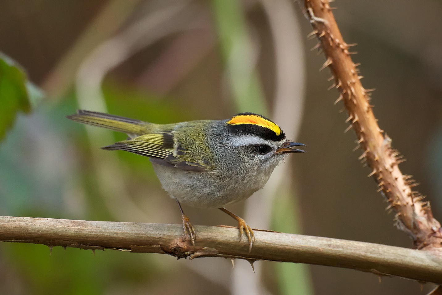 Description: A small bird perched on a branch of a plant with yellow and black markings on its head and body.