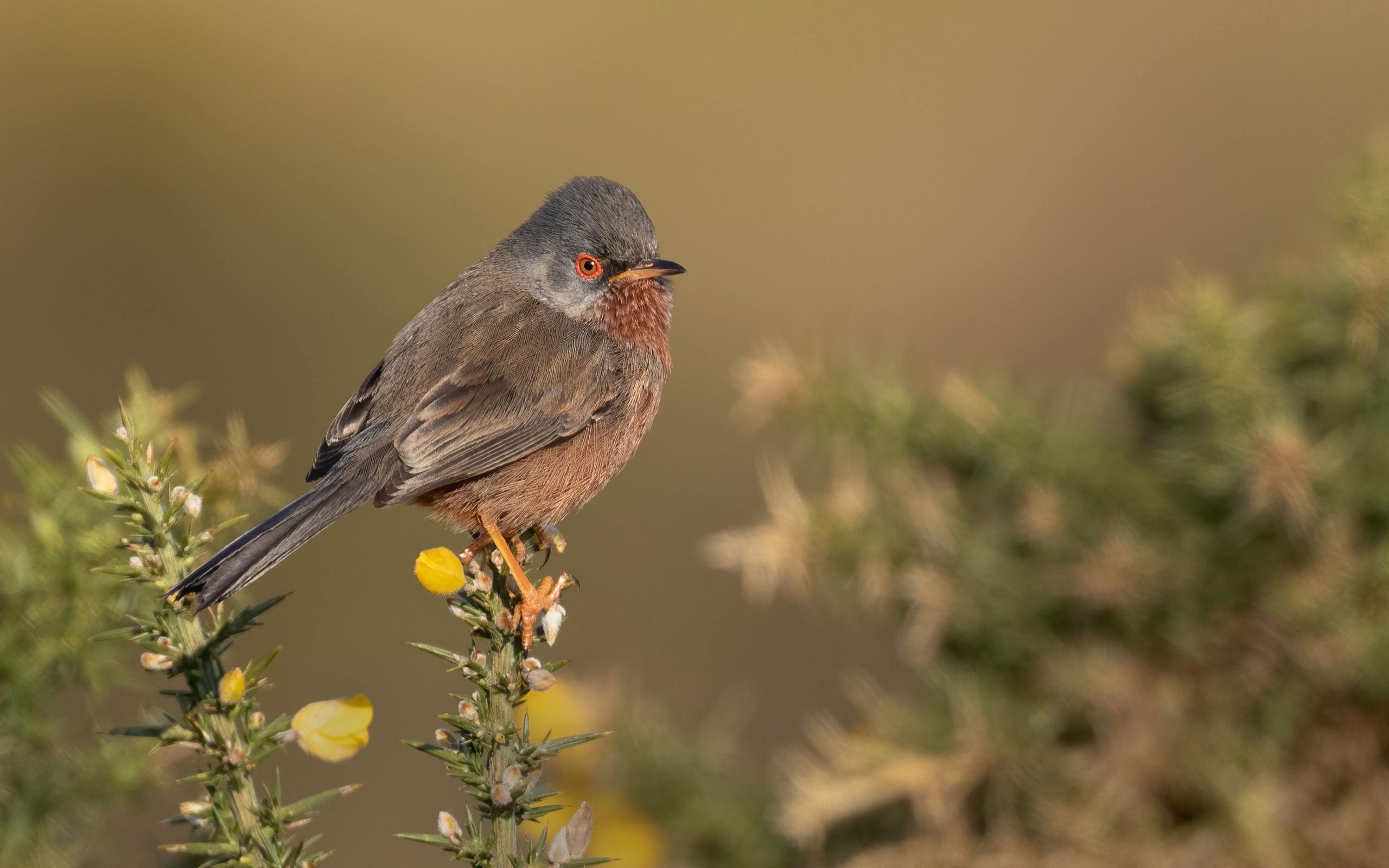 Description: A small bird perched on a small plant with yellow flowers in the background and a blurry background behind it.