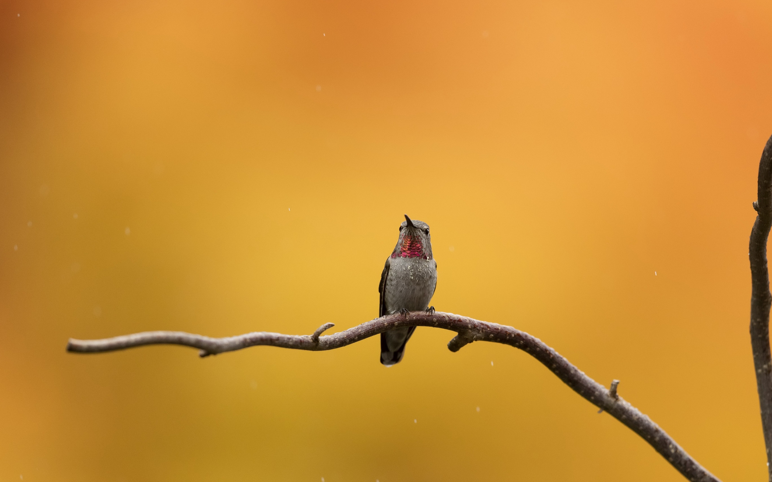 Description: A small bird perched on a branch in the rain with a yellow background and a red spot on its head.