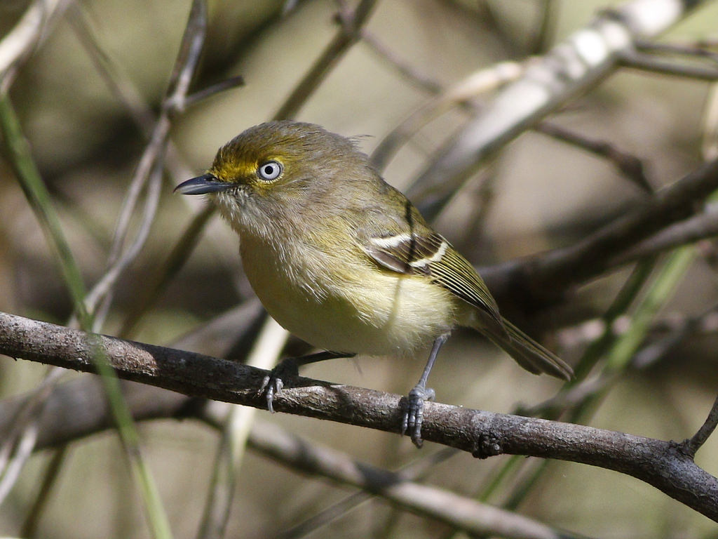 Description: A small bird perched on a tree branch with no leaves on it's branches.