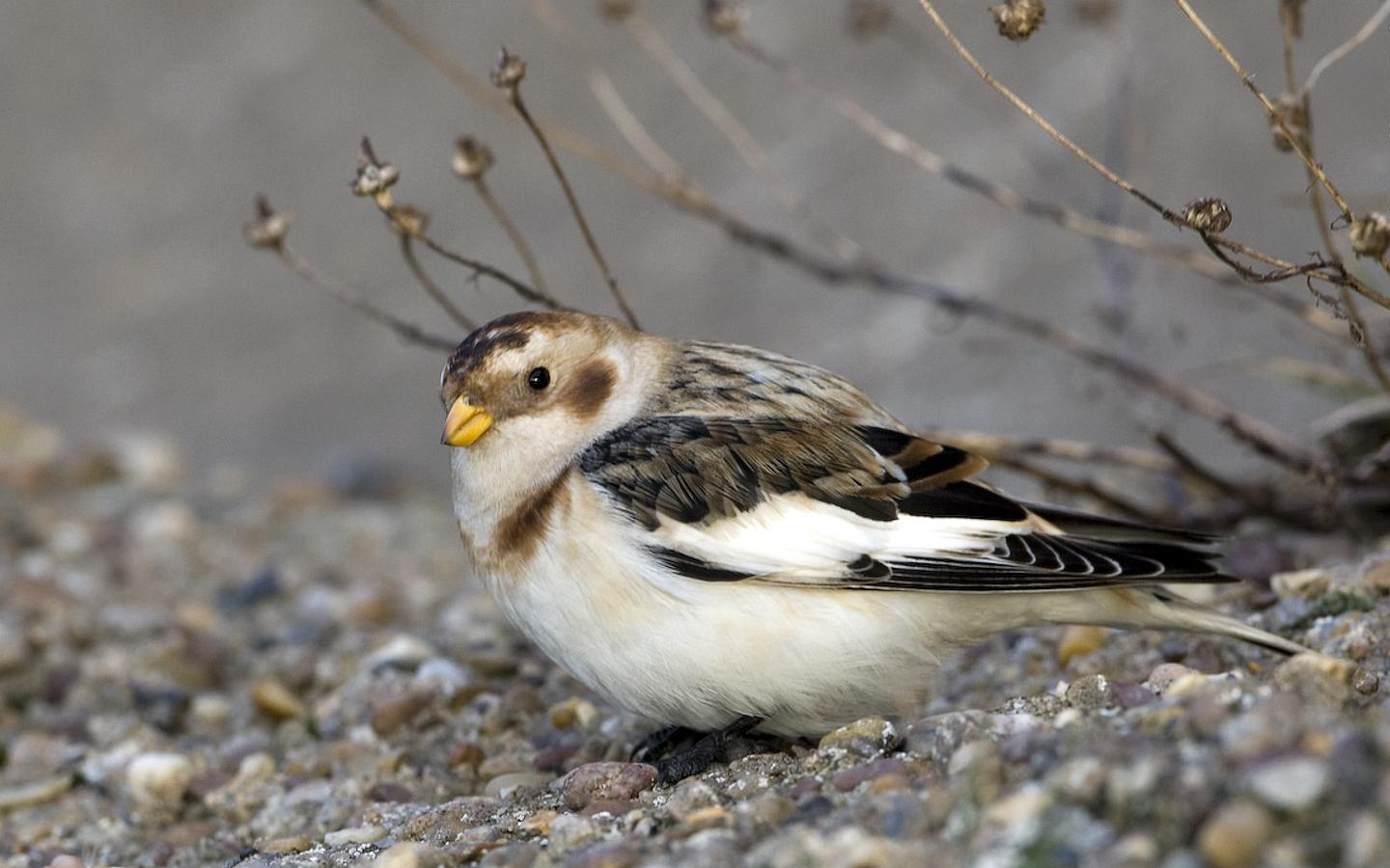 Description: A small bird standing on a rocky ground next to a tree branch with small leaves on it's head.