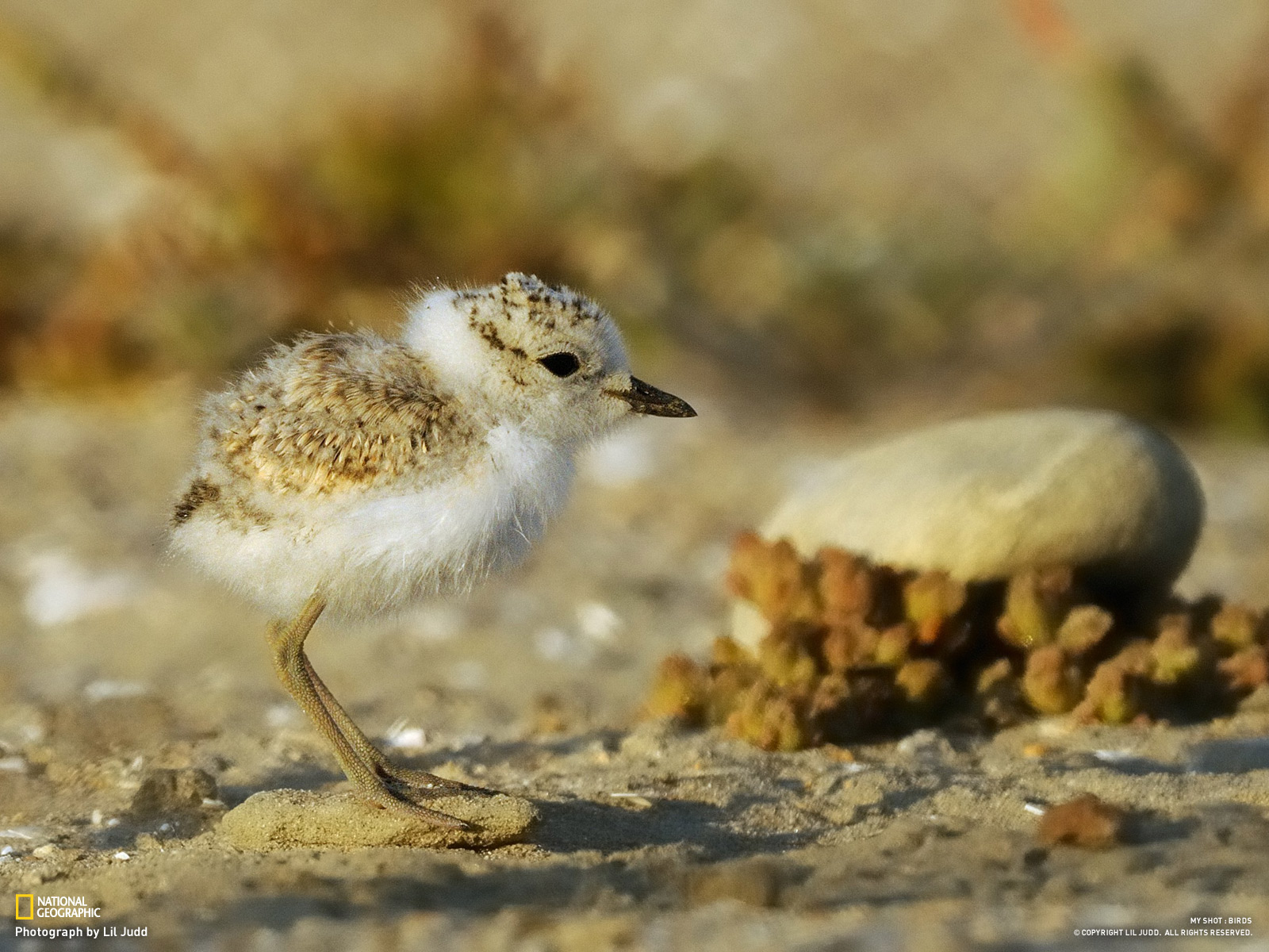 Description: A small bird standing on top of a sandy ground next to a rock and a plant pot on the ground.