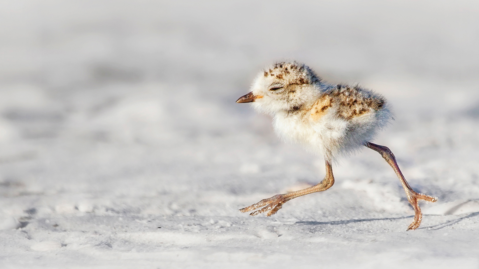 Description: A small bird walking across a snow covered field with its legs spread out and feet spread out.