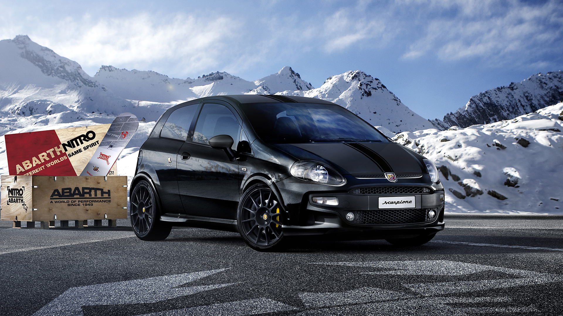 Description: A small black car parked in front of a mountain range with a box of pizza in the back of it.