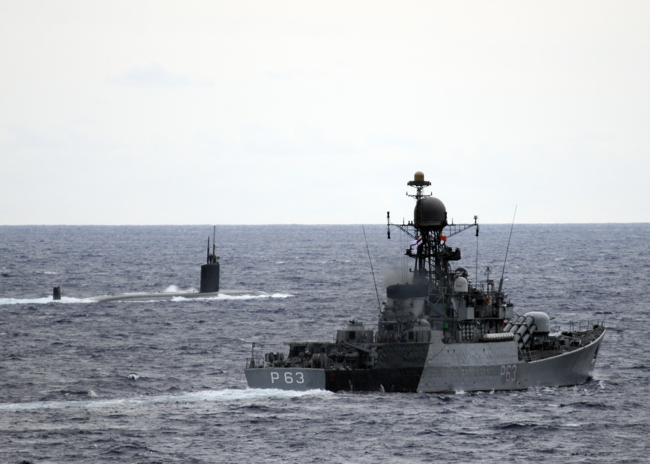 Description: A small boat in the middle of the ocean with a larger boat in the background in the water.