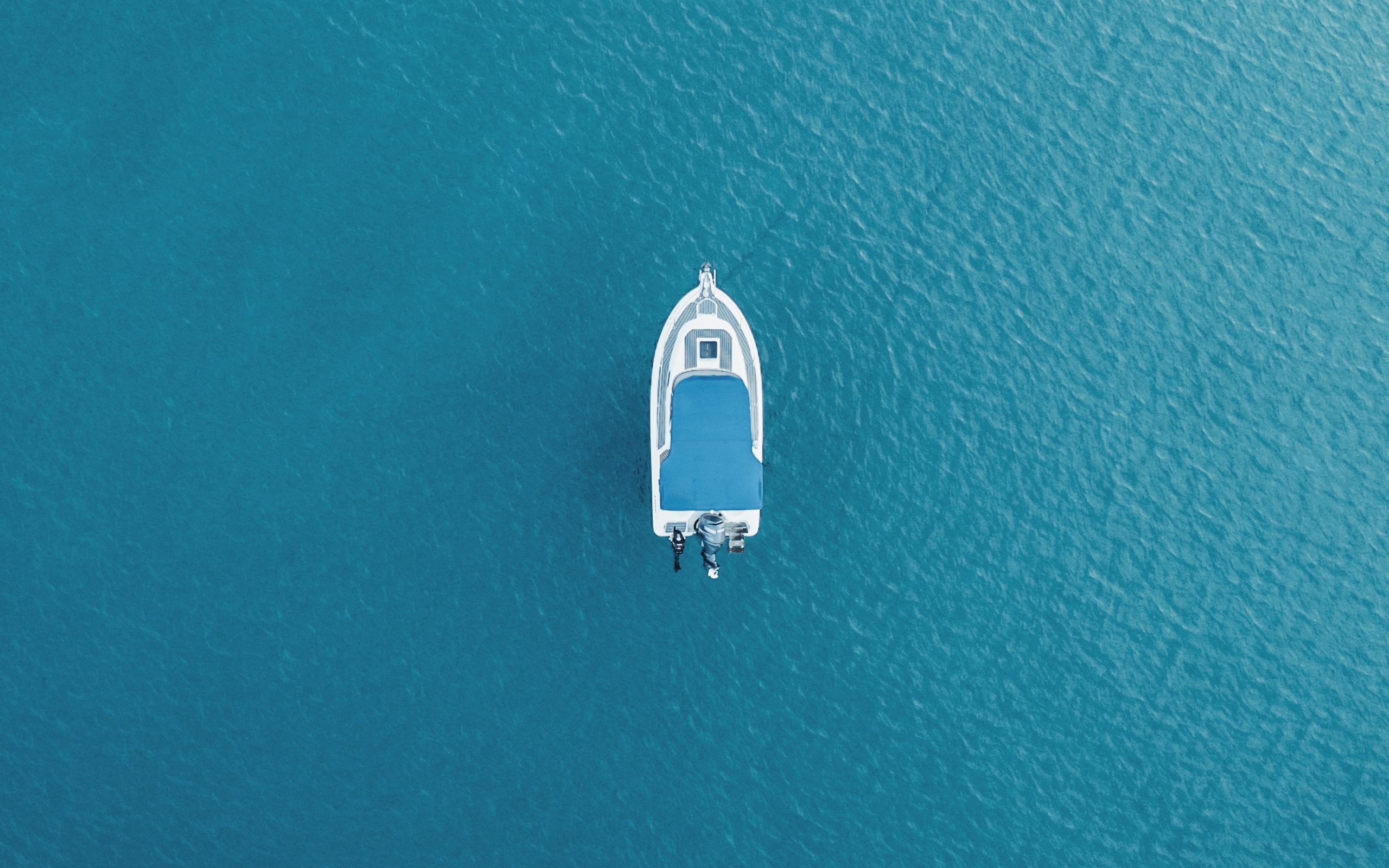 Description: A small boat floating on top of a blue ocean next to a shore line with a boat in the middle.