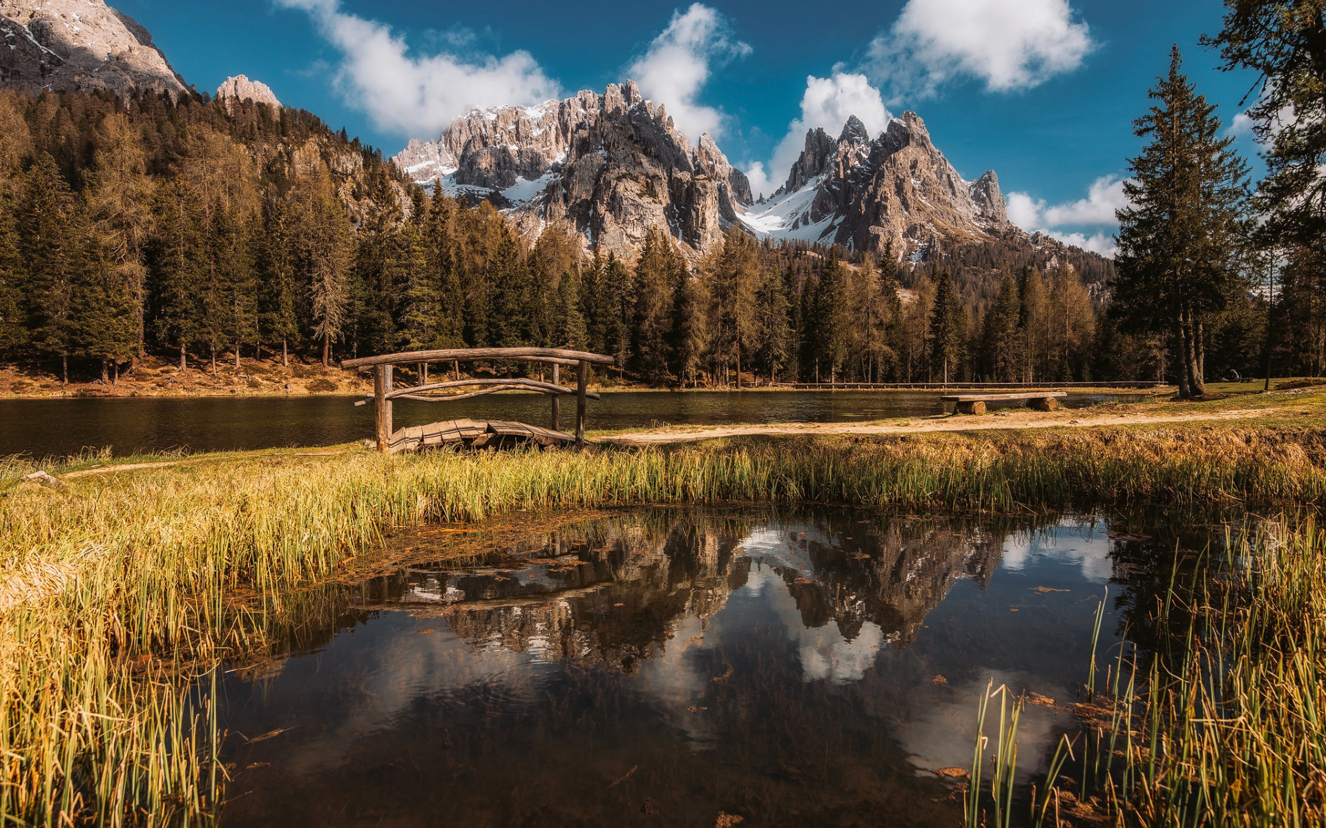 Description: A small bridge over a small pond in a field with mountains in the background and a blue sky with clouds.