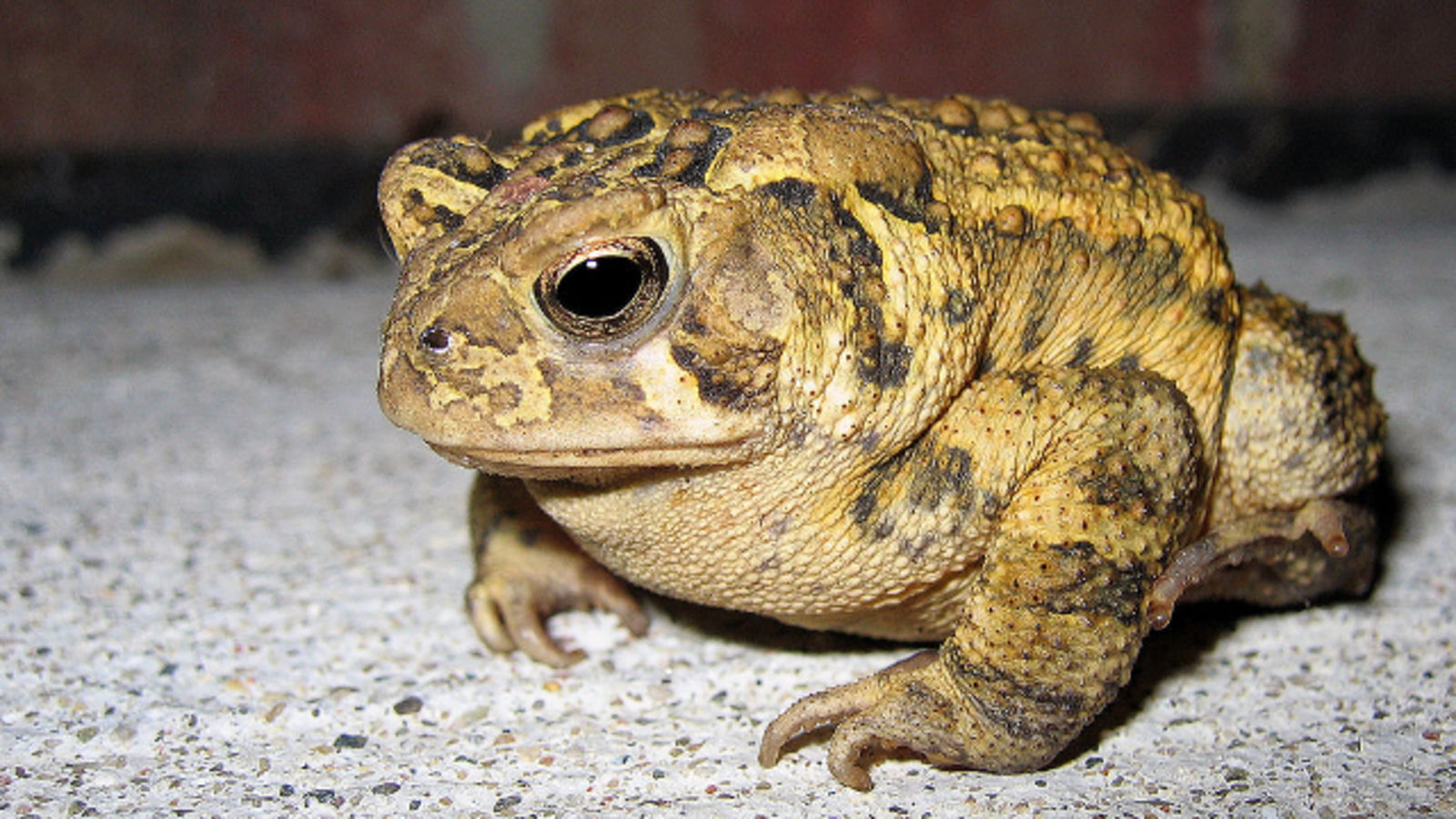 Description: A small brown and black frog sitting on a floor next to a brick wall and a door way with a red door.