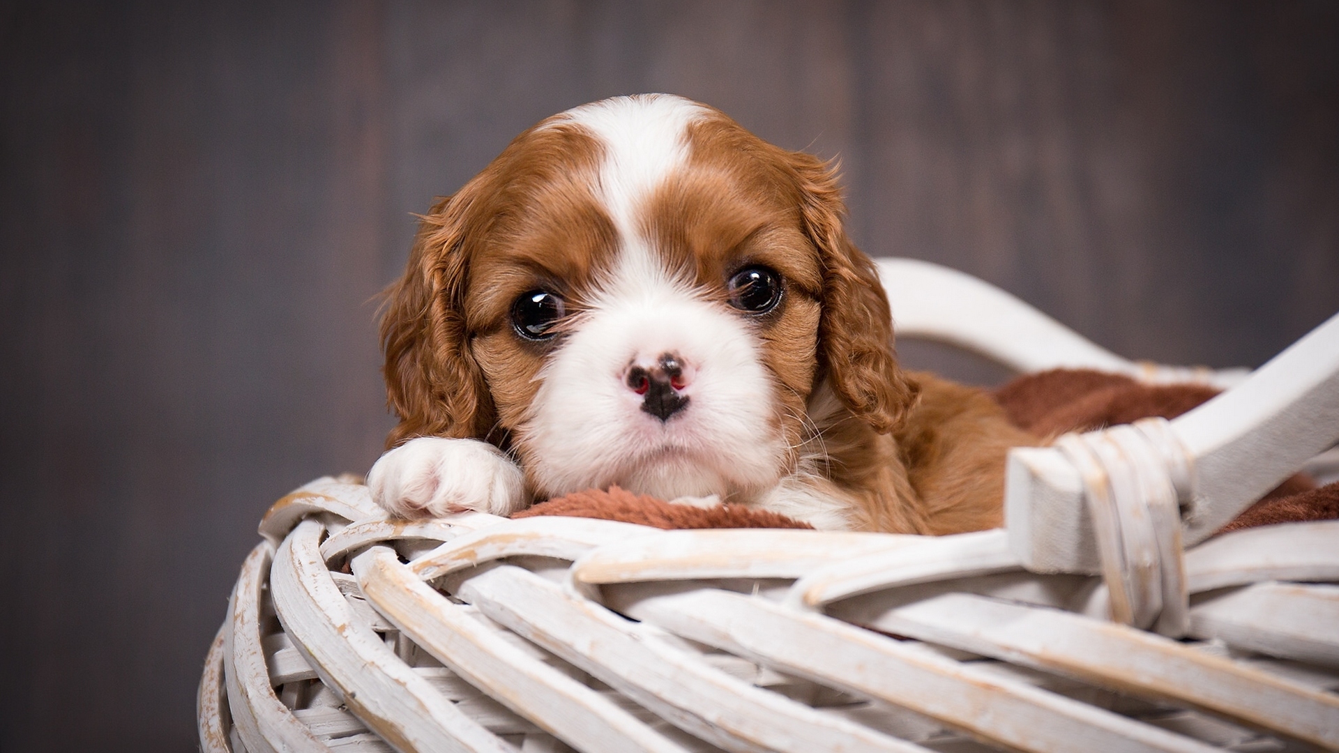 Description: A small brown and white dog laying on top of a chair next to a wooden floor and a wall.