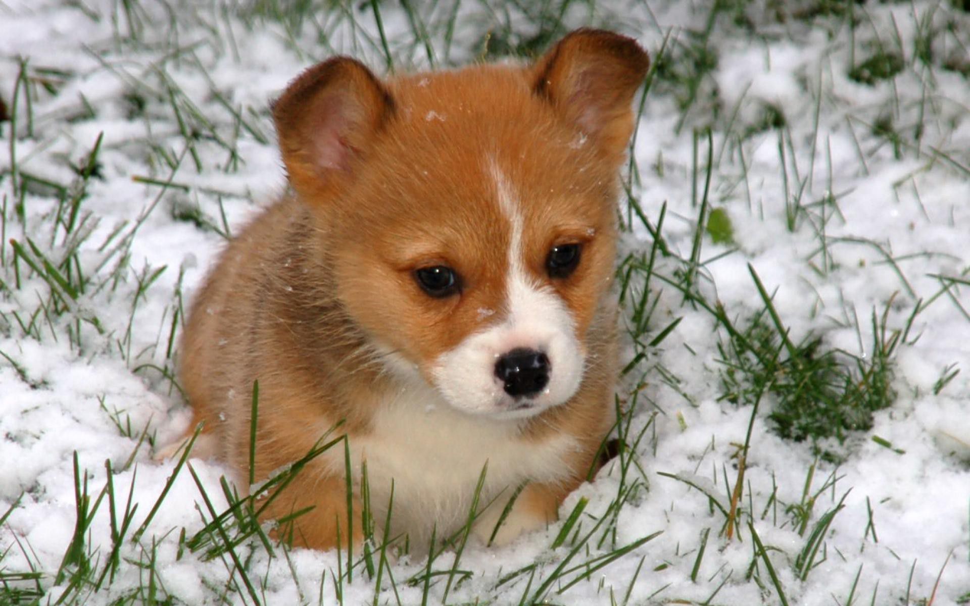 Description: A small brown and white dog laying in the snow on the ground with snow on it's face.