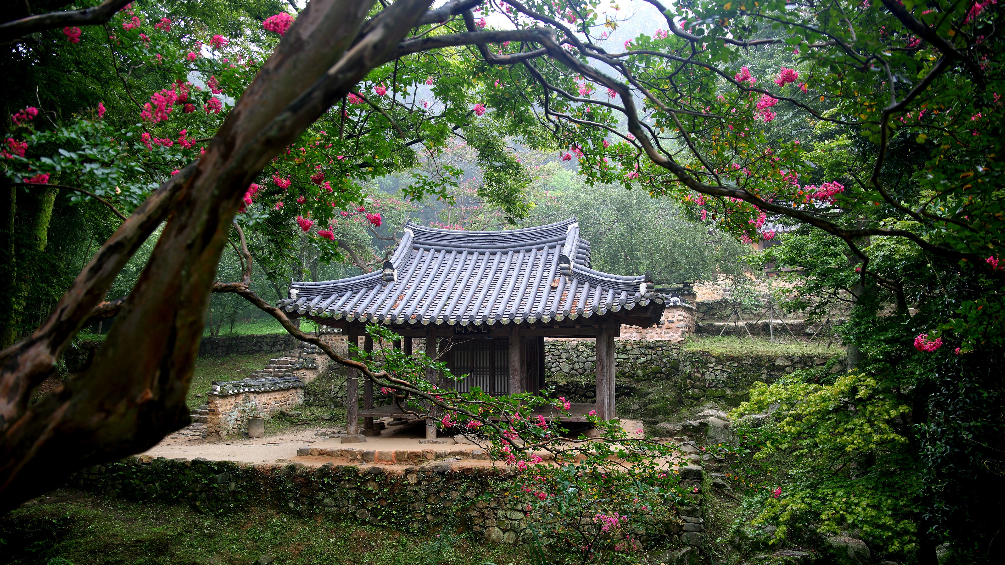 Description: A small building surrounded by trees and flowers in a park area with a stone walkway and a small pond.