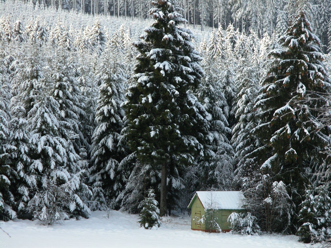 Description: A small cabin in the middle of a snowy forest with trees in the background and a snow covered ground.