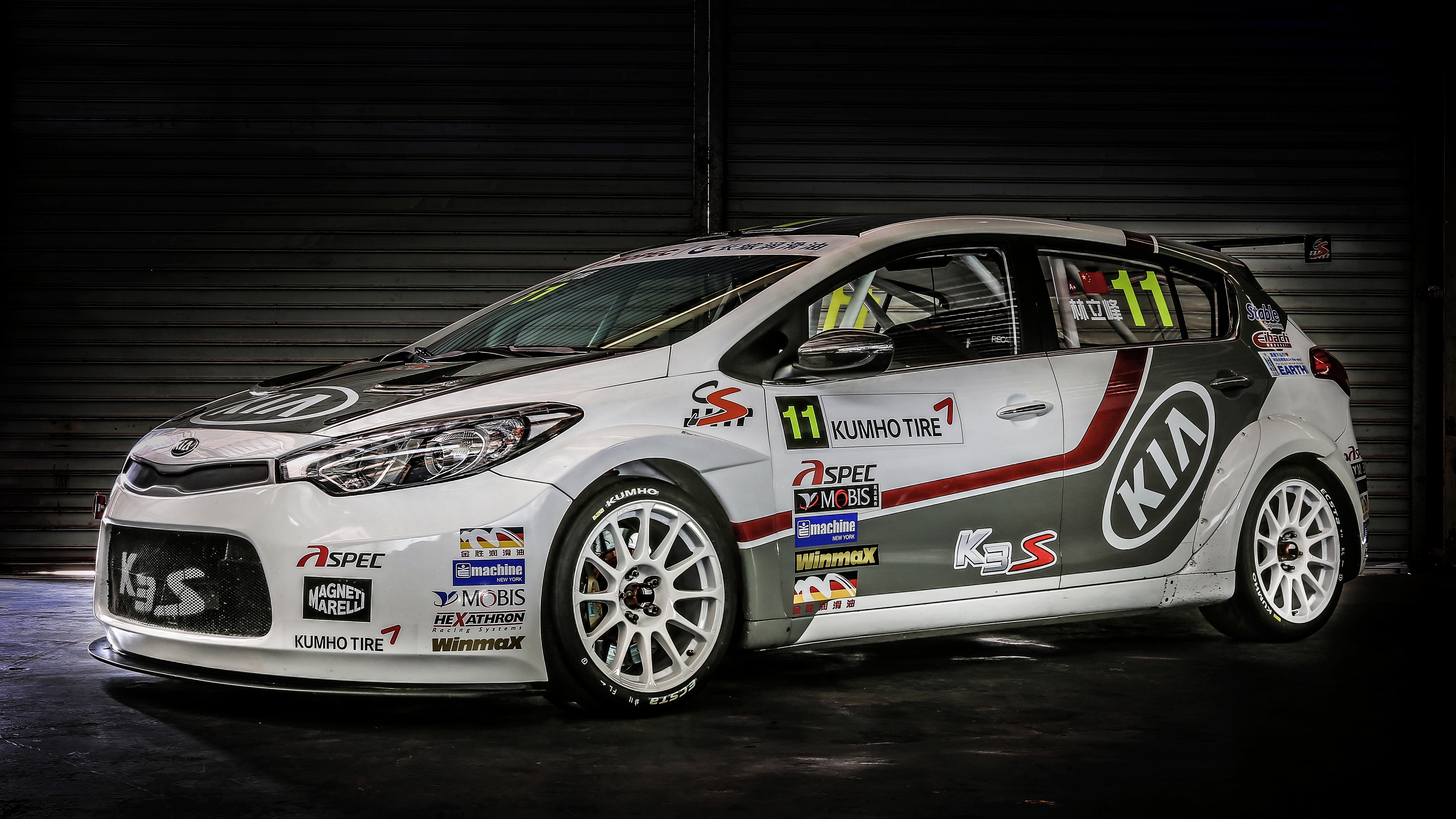 Description: A small car with a number on it's side in a garage area with a garage door behind it.