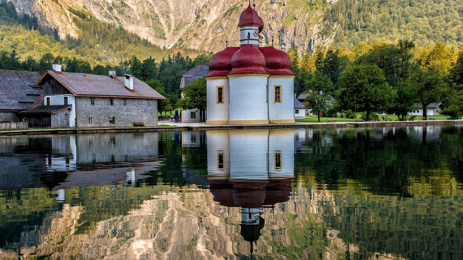 Description: A small church on a lake surrounded by mountains and trees with a reflection in the water and a house in the background.