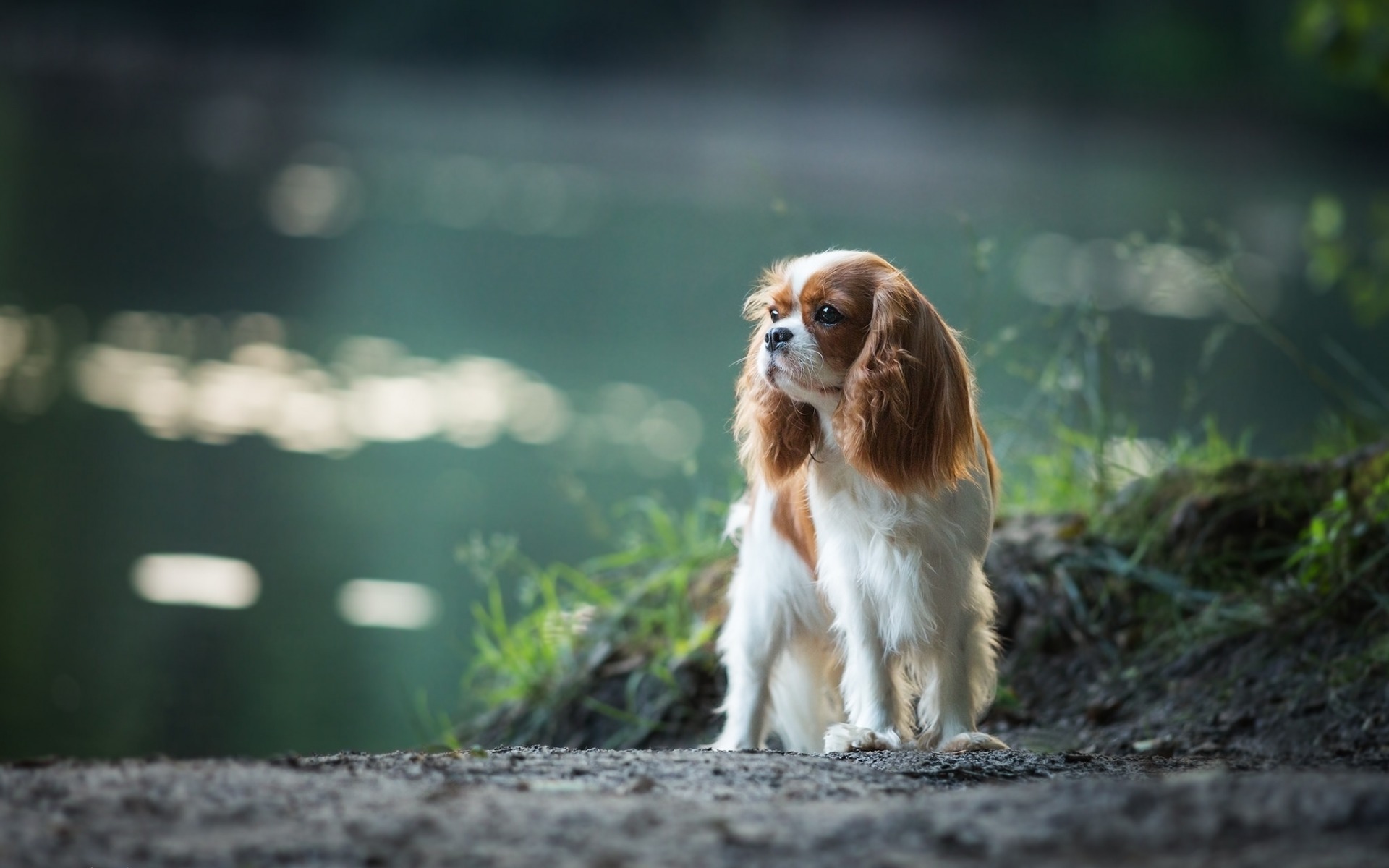 Description: A small dog standing on a dirt road next to a body of water with grass and trees in the background.