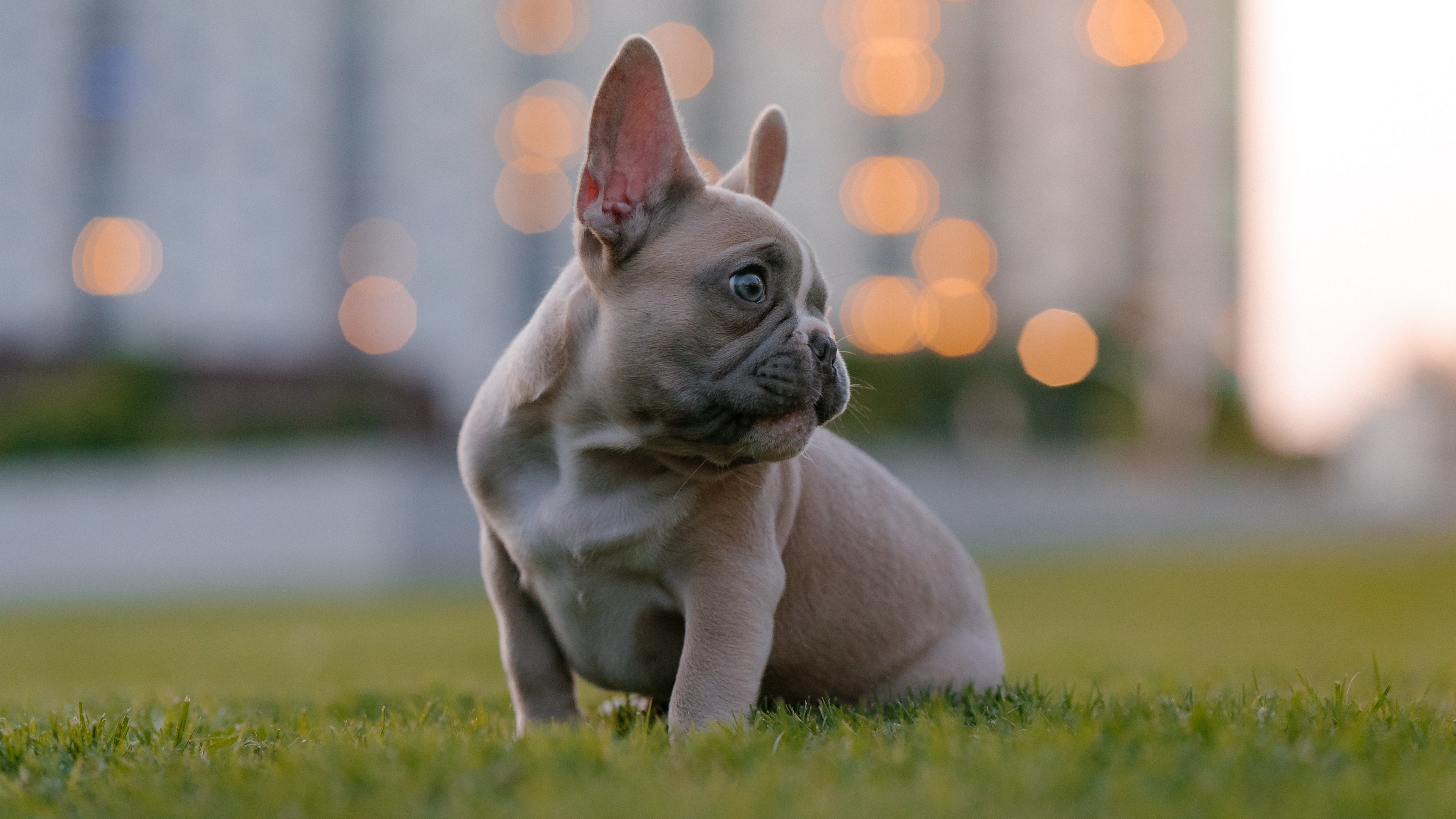 Description: A small dog sitting in the grass with a building in the background and lights on the grass behind it.