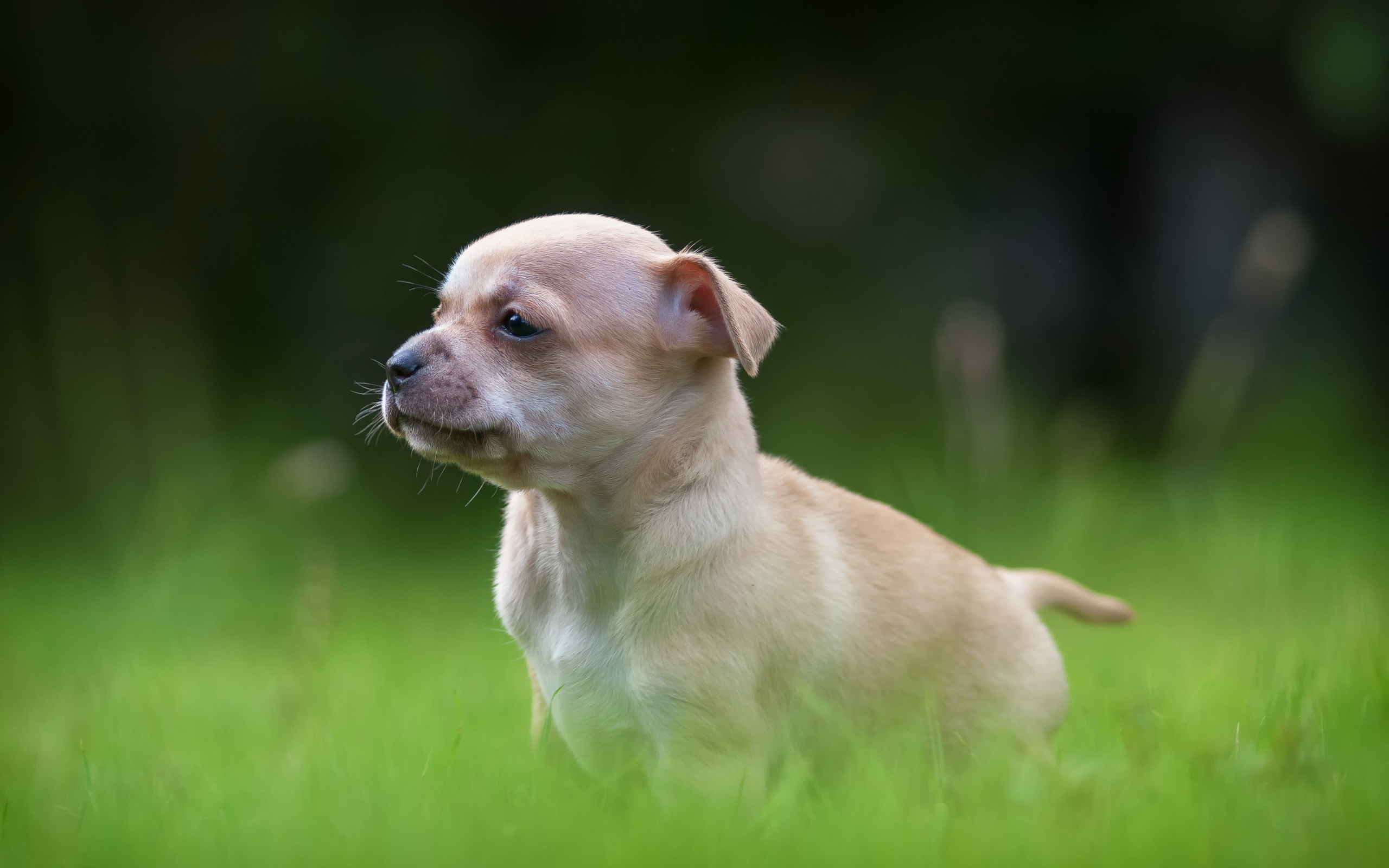Description: A small dog is standing in the grass looking up at something in the distance with a blurry background.