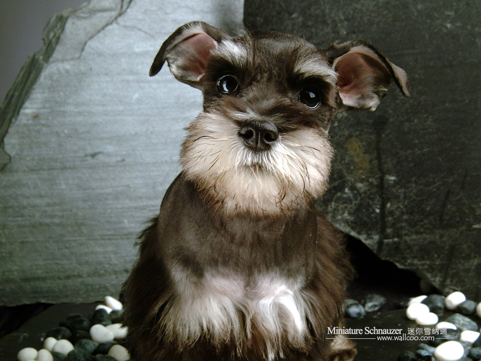 Description: A small dog sitting on a pile of rocks and pebbles looking at the camera with a sad look on his face.