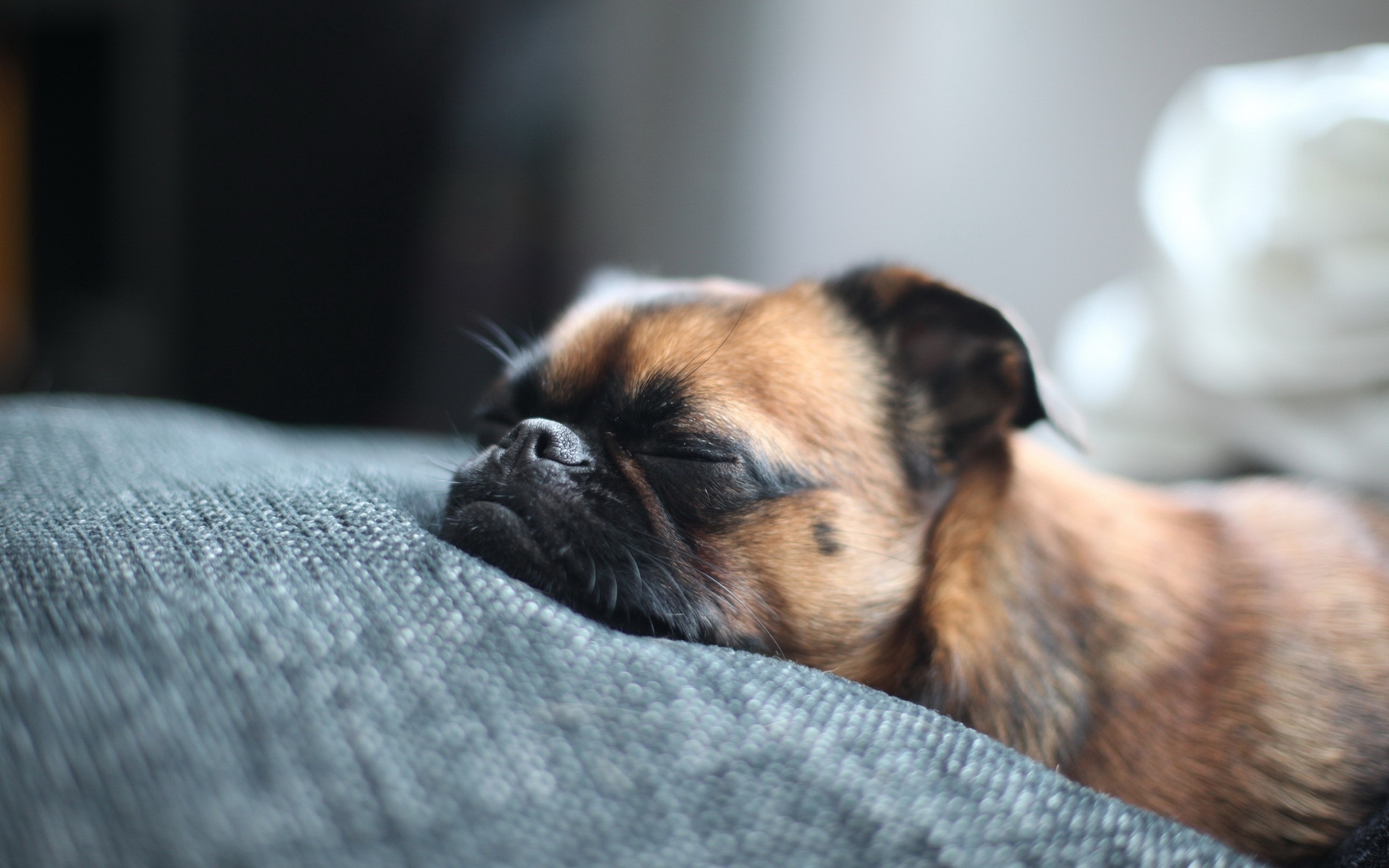 Description: A small dog sleeping on a couch with its eyes closed and his head resting on the pillow of the couch.