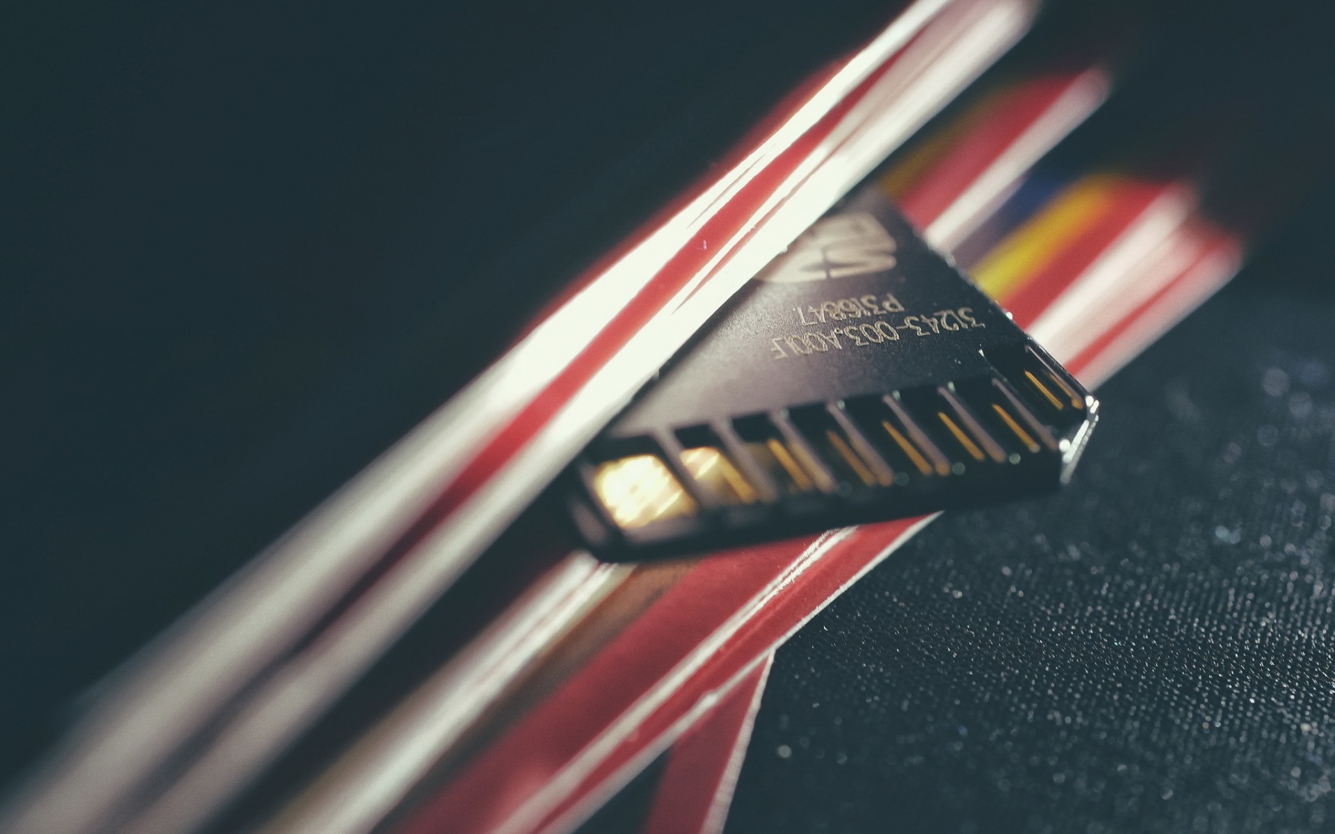Description: A close up of a small electronic device on a cloth with a red and white stripe around it and a black background.